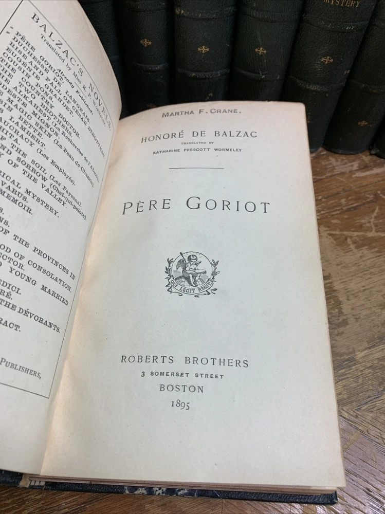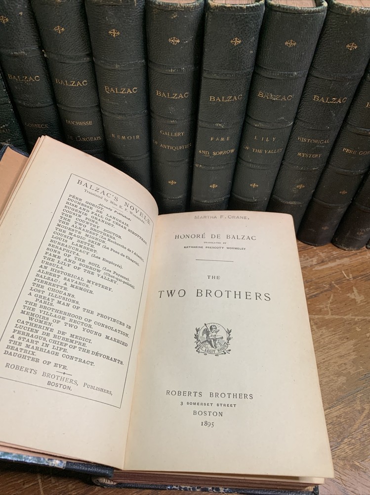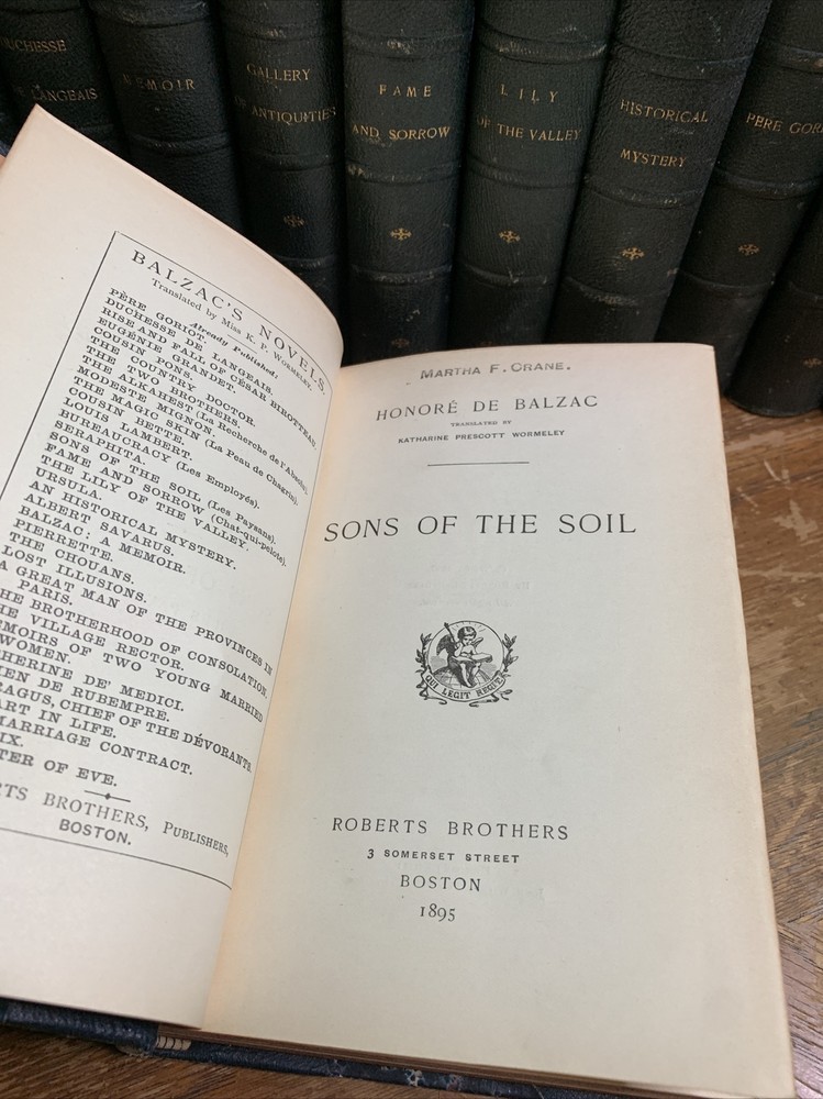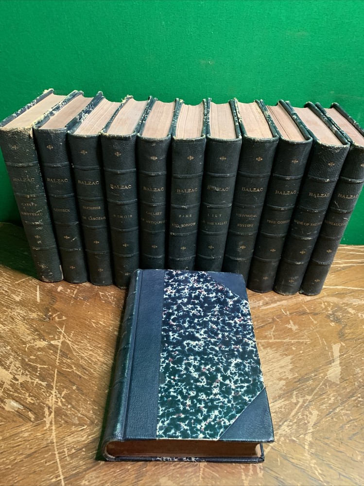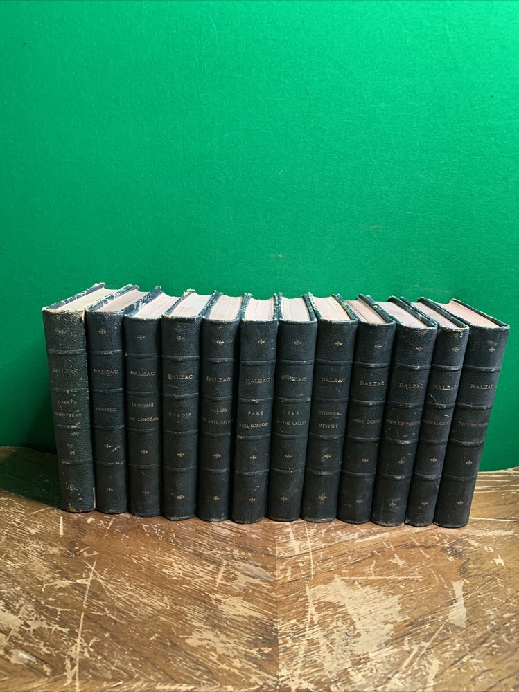 Rare Antique Set Of 12 Leather Bound Books by HONORE DE BALZAC 1895 Roberts Bro Book description: 1/3 black-green/blue leather hardbound, gilt title stamped/embossed on spine covers, marble boards, leather corner tips. Dimensions: 7 1/2" x 5” x 1 1/2” each book. Condition is Antique very good The Item Pictured Is The Item You Will Receive. Please Look At The Photos To Ensure Condition And Decide For Yourself. We combine shipping to save you money Thanks for looking!!! We have a large collection of magazines, books, newspaper, postcard, photos, booklets, and much more! Please ask about discounts on purchases. We have many more items that are not posted yet!