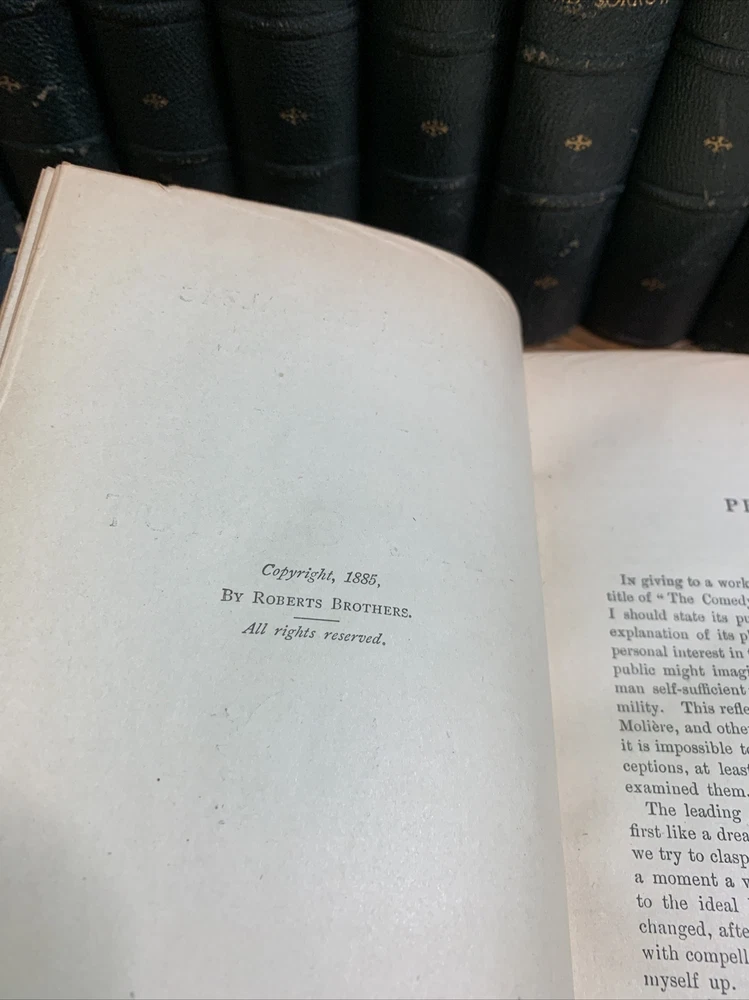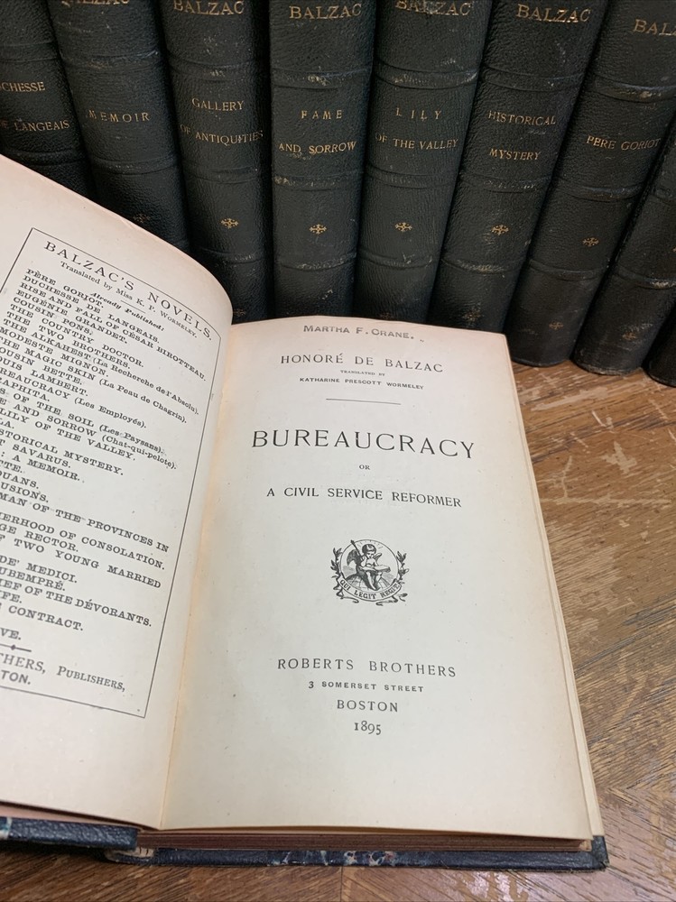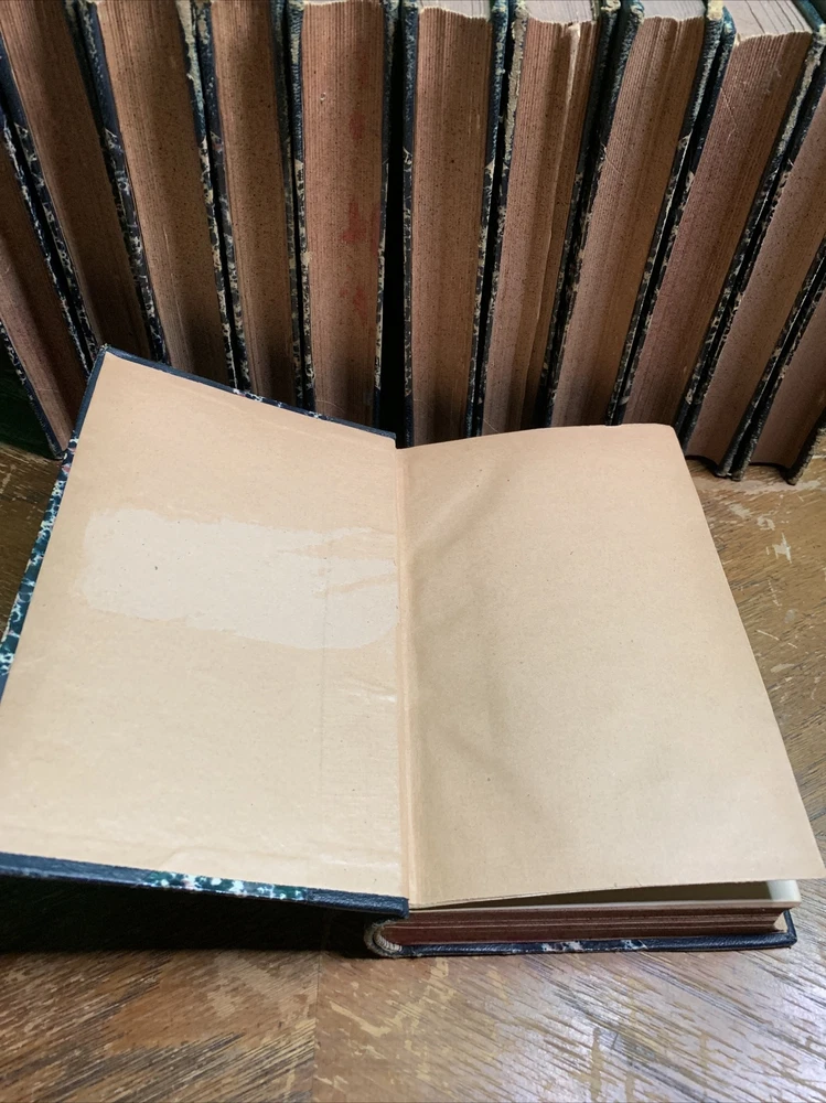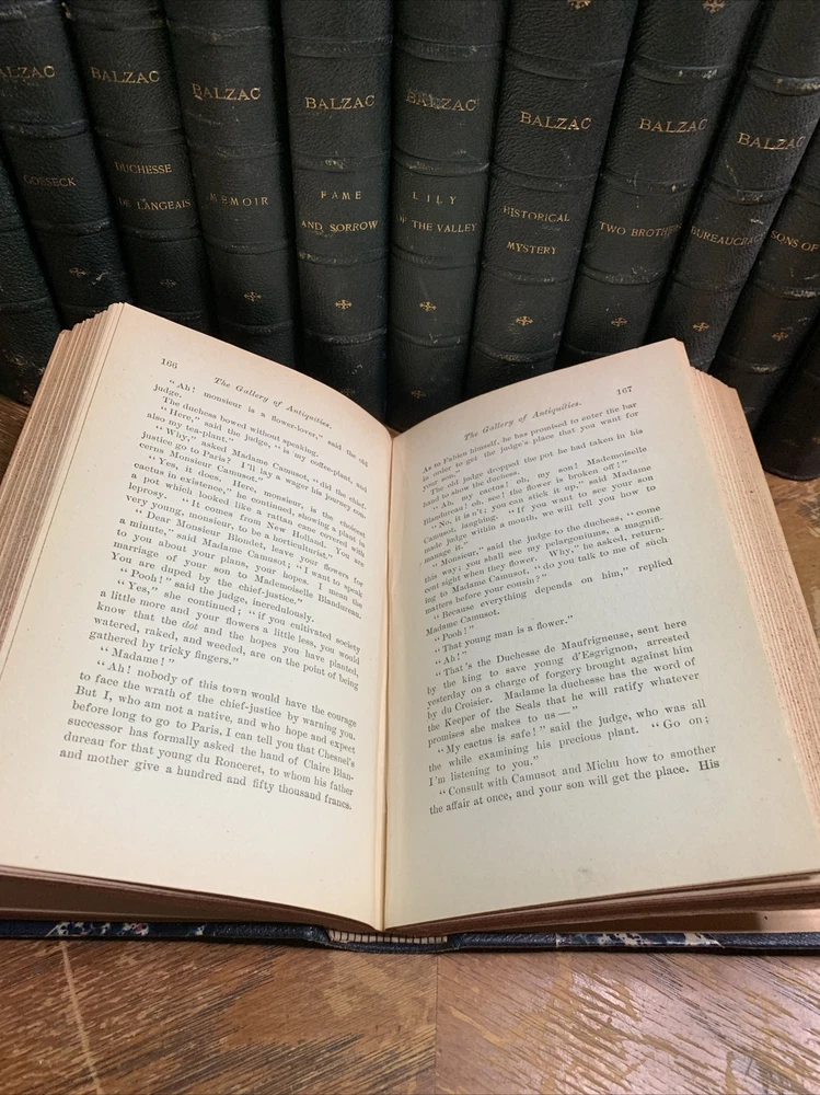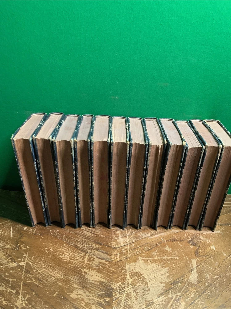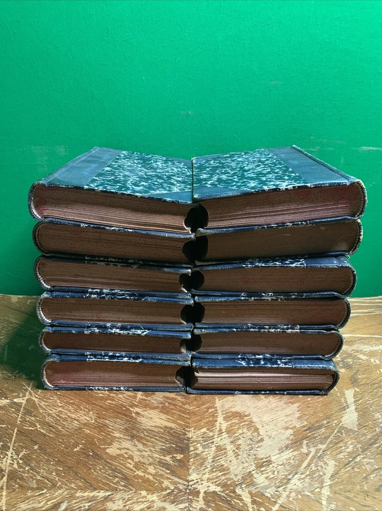 Rare Antique Set Of 12 Leather Bound Books by HONORE DE BALZAC 1895 Roberts Bro Book description: 1/3 black-green/blue leather hardbound, gilt title stamped/embossed on spine covers, marble boards, leather corner tips. Dimensions: 7 1/2" x 5” x 1 1/2” each book. Condition is Antique very good The Item Pictured Is The Item You Will Receive. Please Look At The Photos To Ensure Condition And Decide For Yourself. We combine shipping to save you money Thanks for looking!!! We have a large collection of magazines, books, newspaper, postcard, photos, booklets, and much more! Please ask about discounts on purchases. We have many more items that are not posted yet!