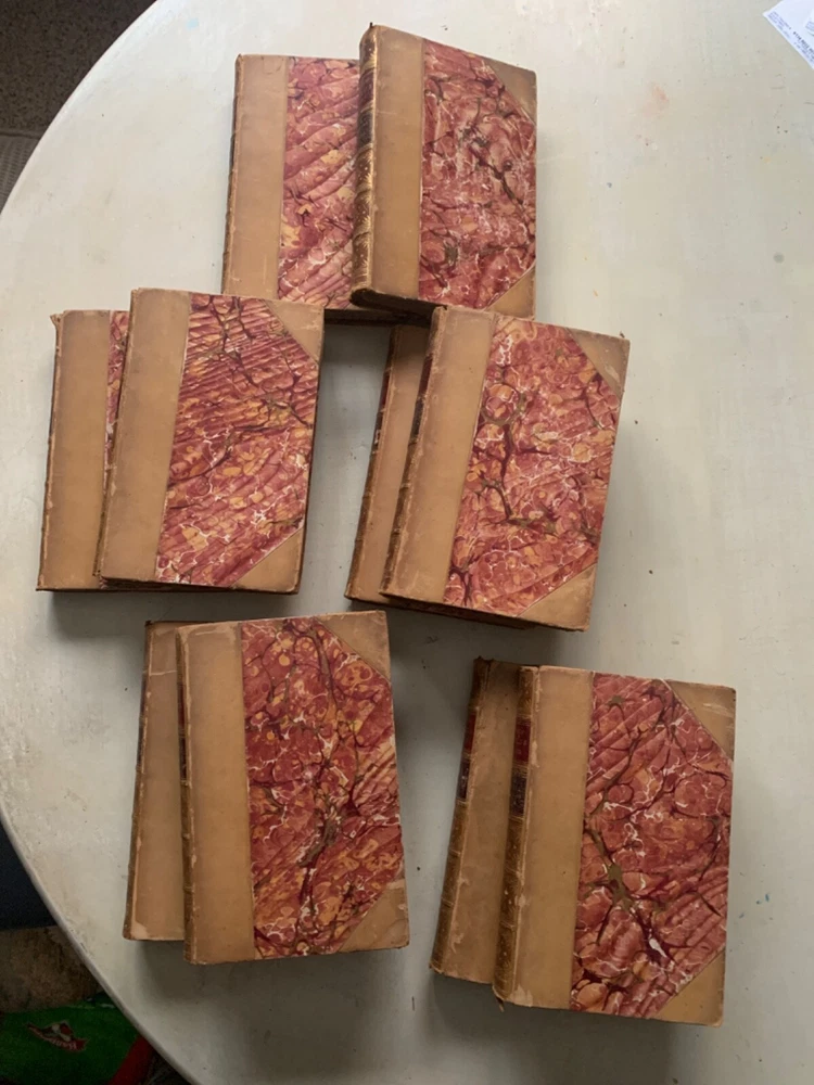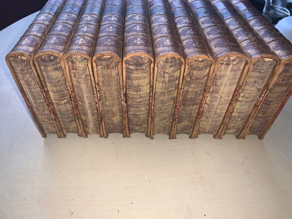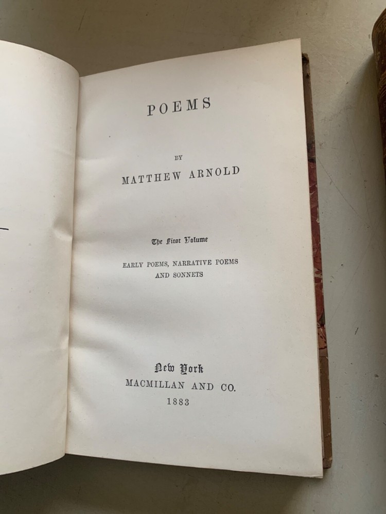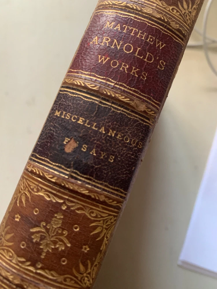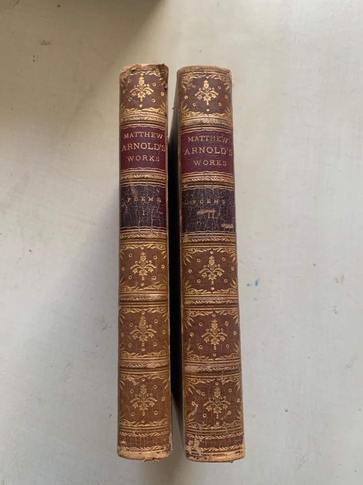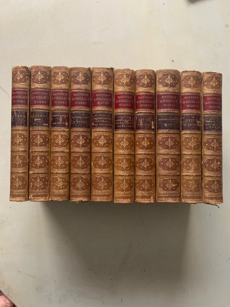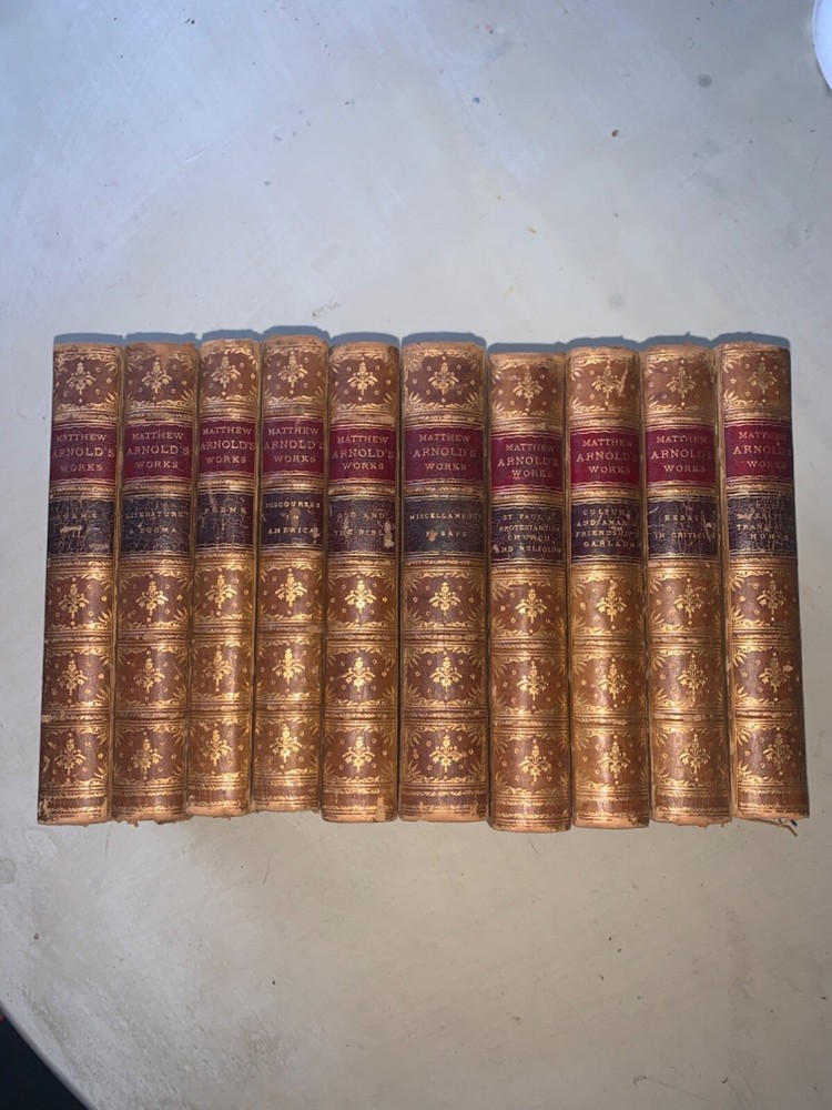 This is a very nice 10 volume set of Matthew Arnold's works. Some scuffs, some some spotty endpapers; one endpaper with a small corner crease; worn spine ends... but few complaints with this lovely set of books. Please look at photos carefully, and I'll list each title with the flaws I notice. But in general--they're just great with strong bindings, unusually clear and bright pages, readable spines, terrific decorated inside covers and page edges, etc. Set has passed down in one family for 5 generations. Buyer will receive provenance information if desired. Volumes are not numbered. MacMillan later published a "Deluxe Edition" with 15 volumes; this set may not be complete, and although the volume on Celtic Literature & On the Translation of Homer seems complete, the words "Volume II" appear (please see photo). The following numbers are my own, just to clarify condition, flaws, etc. Note that "Discourses in America" was published in 1885--an anomaly in this set. 1. Poems; Volume 1. 1883; split at edge of front cover and spine; rough edges on foot and head of spine; some scuffs/scratches on the leather 2. Poems: Volume 2. 1883. some soiling and "bubbling" on final endpaper; minor scuffing 3. Discourses in America 1885; minor scuffing; wear at head and foot of spine; minor spots on early endpapers 4. Literature and Dogma: Essay on Better Interpretation of the Bible; 1883. Head and foot of spine are scuffed/bumped; corners show some wear 5. St. Paul and Protestantism; Church and Religion. 1883. Some creases on early endpapers; scuffing of covers & roughness at head and foot of spine; some underlining in pencil here and there. 6. Culture and Anarchy; Friendship's Garland. 1883. Some wrinkling on early pages; scuffs; minor spine edge rubbing/wear 7. God and the Bible 1883 Some wrinkling and soiling on early endpapers; usual scuffing and wear to exterior; rubbing affects title on spine; 8. Miscellaneous Essays; 1883; title etiquette damaged; wear at head and foot of spine 9. Essays in Critiscism; 1883. Split at top of spine/front board; scuffing 10. Celtic Literature & Translating Homer 1883; frayed leather at head and foot of spine; scuffing; this is the volume that reads "Volume II after the title page, which doesn't indicate that the volume is incomplete. kevindaleybooks-t Note: I try to identify any flaws in books as much as possible. Sometimes a photo will catch something that I hadn't noticed when making the listing--so it's good practice to look at the photographs as well as to read the listing. I want buyers to be pleased with what they buy! Thanks for looking