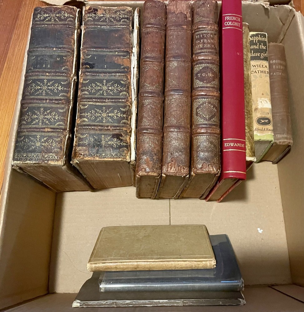 List in progress: Abrege’ chronologique ov extract de L’Histoire De France Pae Le Sieur De Mezeray Historiograohe de France. Divise’ En Trous Tomes. 1668. Historian D’ELLA Ultima Guerra Nel Frivli Di Faustino Moiseso Libri duc…Sig. Francesco Errizzo. 1623. Goethe Faust 1856 An Historical Survey Of The French Colony In The Island Of St. Domingo…By Bryan Edwards. 1797 Notitia Orbis Antiqui, sive Geographia Plenior…Christophorus Cellarius…Novis Tabulis Geographicis…L. 10. Conradus Schwartz. 1732. 2 volumes. Belgii Confederati Respublica: sev Gelriae. Holland. Zealand. Traject. Fris. Transisal. Groning. Chorographica Politicaque description. Cum Privilegio. LAET, iJoannes de Belgii confederati Respublica : sev Gelriae Holland, Zeland, Traject, Fris, Transisal, Groning, chorographica politicaque descriptio. Lugd. Batav. [Leiden] : Ex officina Elzeviriana, 1630. Details: Collation: Complete with all pages [16], 352, [12] References: Willems 326; Goldsmid I, 34 Language: Latin Binding: Vellum; tight & secure Size: ~4.5in X 2.5in (11.5cm x 6cm) Sapphira and the slave girl - Willa Cather. 1940. Snowbound - John Whittier 1866 A Boy’s Will - Robert Frost 1915 first American Voyage Autour Du Monde, Et Principalement Ala Cote Nord-Ouest De L’Amerique. Fait enough 1785, 1786 , 1787 et 1788. 2 volumes. 1789 . George Dixon. Dramatick Writings Of Will. Shakspere. Printed for John Bell, London. 1788. 15 Volumes. Full calf. Bookplate of Sir Thomas Gooch. 18mo. Works of Eugene Sue in 11 Volumes. Connoisseur Edition No. 21 out of 100. 1899. 3/4 blue leather over marbled boards, with marbled endpapers. Octavo. SIGNED 1st Editions Tim O’Brien - The Things They Carried Tim O’Brien - July, July Tim O’Brien - Tomcat in Love Alice Walker - The Temple Of My Familiar Alice Walker - The Color Purple Charles Frazier - Cold Mountain Lorrie Moore - A Gate At The Stairs Gabriel Garcia Marquez First Editions One Hundred Years of Solitude - Stated 1st Love in the Time of Cholera - Stated 1st, 4th Love in the Time of Cholera - Stated 1st, 8th Love in the Time of Cholera - Stated 1st Love in the Time of Cholera - Stated 1st Of Love and Other Demons - Stated 1st Of Love and Other Demons - Stated 1st No One Writes to the Colonel - Stated 1st No One Writes to the Colonel - Stated 1st, no dust jacket Leaf Storm - Stated 1st The General In His Labyrinth - Stated 1st The General In His Labyrinth - Stated 1st The General In His Labyrinth - Stated 1st, 4th News Of A Kidnapping - Stated 1st Living To Tell The Tale - Stated 1st Others Chronicle Of A Death Foretold 10 paperbacks LARRY McMURTRY 1st Editions Comanche Moon Duane’s Depressed The Late Child Streets of Laredo Streets of Laredo Toni Morrison 1st Editions Beloved Beloved Love Paradise Ian Fleming - Chitty Chitty Bang Bang. Random House First Edition, 1964, Octavo with top stained black. No dj. Joyce Carol Oates - Bellefleur. E. P. Dutton First Trade Edition. 1980. Octavo. Barbara Kingsolver - The Poisonwood Bible. HarperCollins Stated First Edition. 1998. Octavo. John Steinbeck - The Moon Is Down. The Viking Press. 1942. 12mo. John Steinbeck - The Winter Of Our Discontent. 1961. No DJ. Octavo. D. H. Lawrence - Lady Chatterley’s Lover. 1928. Octavo. Langston Hughes - Selected Poems. 1959. No DJ. Octavo. Kate Douglas Wiggin - Bluebeard. 1914. 16mo. Inscribed. Kate Douglas Wiggin - The Birds’ Christmas Carol. 16mo. Later edition. Inscribed. Robert Heinlein - Job: A Comedy Of Justice. 1984. Octavo. Isaac Asimov - Nemesis. 1989. Octavo Arthur C. Clarke - Imperial Earth. 1976. Early edition. Octavo. Donald Barthelme - Amateurs. 1976. Octavo. James Jones - From Here To Eternity. 1951. Later edition. Octavo. Richard Ford - The Lay Of The Land. 2006. Octavo. Joyce Carol Oates - We Were The Mulvaneys. 1996. Octavo. Colleen McCullough - The First Man In Rome. 1990. Second Printing. Octavo. Colleen McCullough - Caesar A Novel. 1997. Second Printing. Octavo. Barbara Tuchman - A Distant Mirror. 1978. Later Printing. Octavo. Frank McCourt - Angela’s Ashes. 1996. Later Printing. Octavo. Frank McCourt - ‘Tis. 1999. Octavo. Simon Schama - Rembrandt’s Eyes. 1999. Large Octavo. Stefan Lorant. The Glorious Burden. 1968. Inscribed! No DJ. Quarto. Jeff Shaara - Gods And Generals. 1996. Inscribed. Octavo. Jeff Shaara - The Last Full Measure. 1998. Signed. Second Printing. Octavo. Jeff Shaara. The Glorious Cause. 2002. Signed. Octavo. Michael Shaara - The Killer Angels. Later Edition. Octavo. Alison Weir - Innocent Traitor. Civil War & Indian Wars Thomas Mails - Dog Soldiers, Bear Men And Buffalo Women. 1973. Quarto. William Chalfant - Without Quarter: The Wichita Expedition And The Fight On Crooked Creek. 1991. Octavo. Marshall Sprague - Massacre: The Tragedy At White River. 1980. Octavo. John Edward Weems - Death Song: The Last Of The Indian Wars. 1991. Octavo Cyrus Townsend Brady - The Sioux Indian Wars. 1992. Octavo. John Monnett - The Battle Of Beecher Island And The Indian War Of 1867-1869. 1992. Octavo. James Mooney - The Ghost-Dance Religion And The Sioux Outbreak Of 1890. 1991. Octavo. Hugh Dempsey - Red Crow Warrior Chief. 1980. Octavo. Colin Calloway - The American Revolution In Indian Country. 1995. Octavo. Allan Eckert - A Sorrow In Our Heart: The Life Of Tecumseh. 1992. Octavo. George Bird Grinnell - The Fighting Cheyennes. 1995. Octavo. Edward Lazarus - Black Hills White Justice. 1991. Octavo. John Ross Browne - Adventures In The Apache Country. 1974. Octavo. Robert Utley - The Lance And The Shield. 1993. Octavo. Stan Steiner - The Vanishing White Man. 1976. Octavo. Civil War Evan Connell - Son Of The Morning Star. 1984. Octavo. Bruce Catton 8 S. R. Crockett - The Black Douglas. 1899. Octavo. William Lee Miller - Lincoln’s Virtues. 2002. Octavo. Literature William Carlos Williams - The Selected Letters Of William Carlos Williams. 1957. No DJ. Octavo. William Carlos Williams - In The American Grain. 1925. No DJ. Octavo. William Carlos Williams - 
