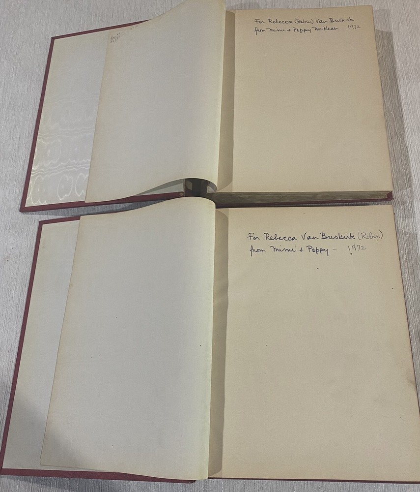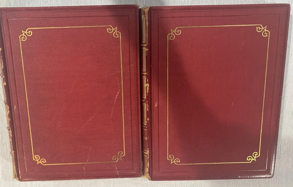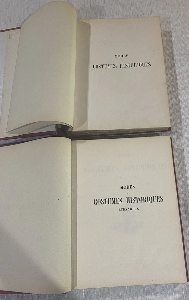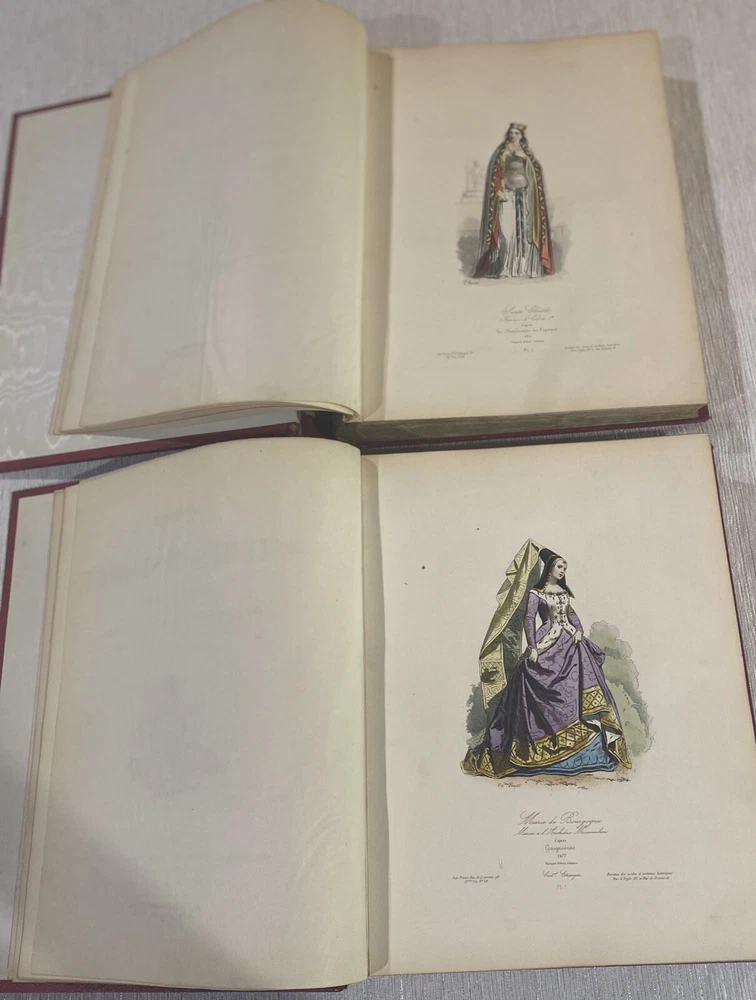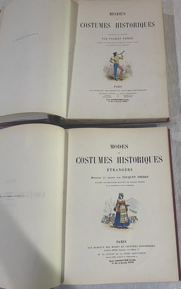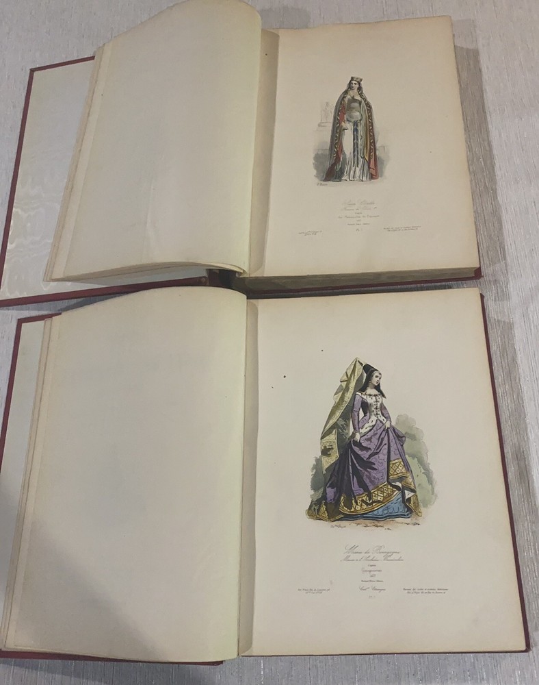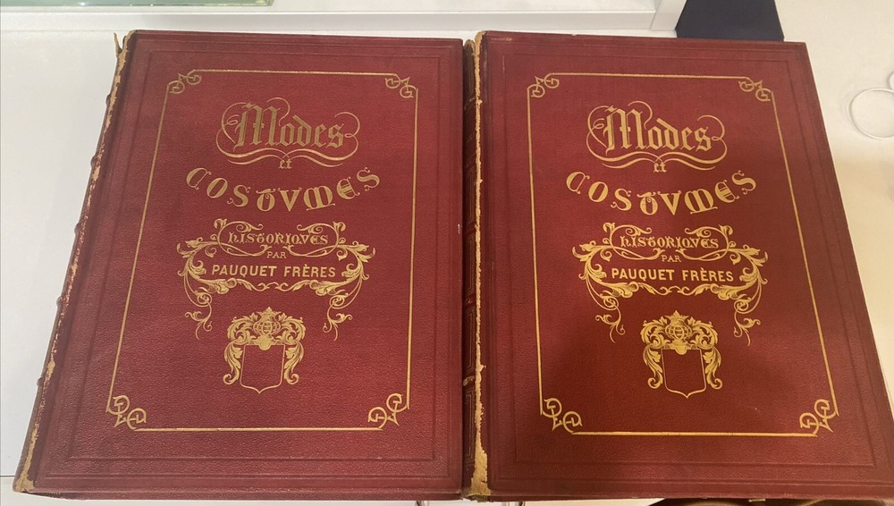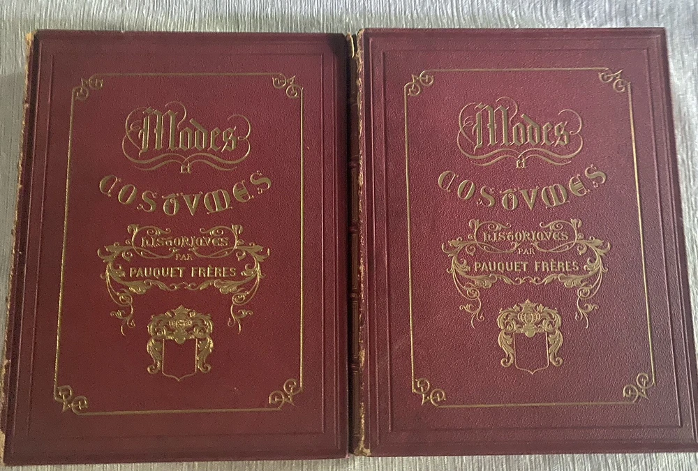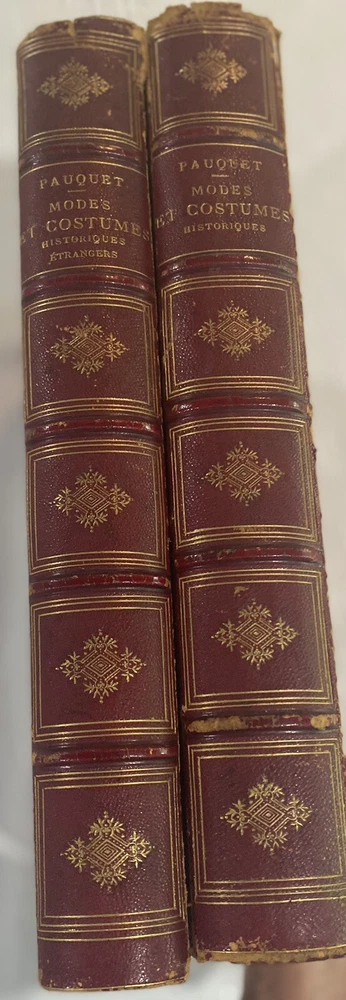 Pauquet Frères Modes et costumes historiques étrangers; Modes et costumes historiques français. Paris: Pauquet Frères, [c. 1875 & 64 2 volumes, 4to (308 x 230mm.), half-titles, coloured vignettes on title-pages, 192 coloured plates (96 in each volume), letterpress lists of plates, contemporary red pebbled cloth gilt, gilt edges Original set in as is condition- see pictures Binding not in good condition; writing on inside cover page.