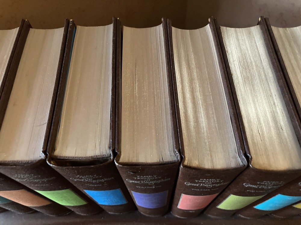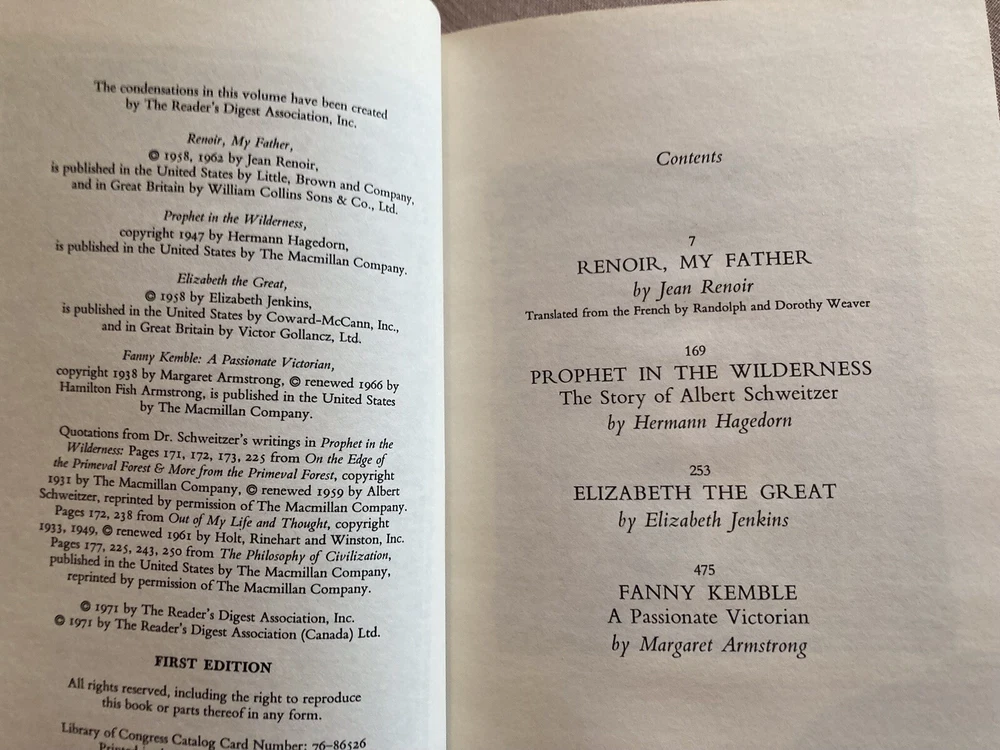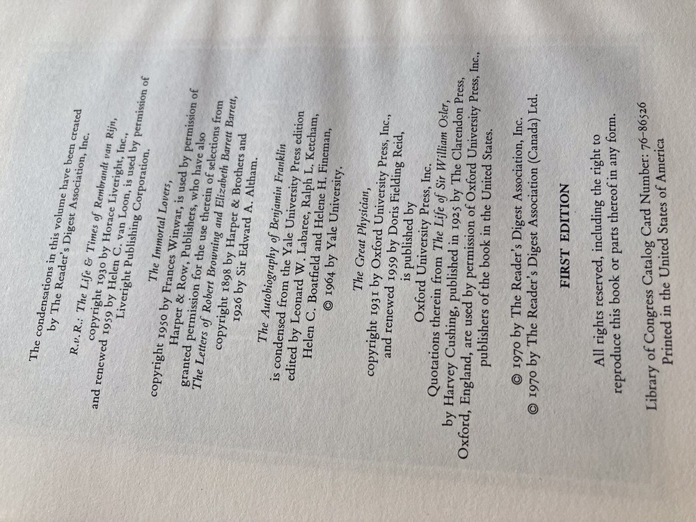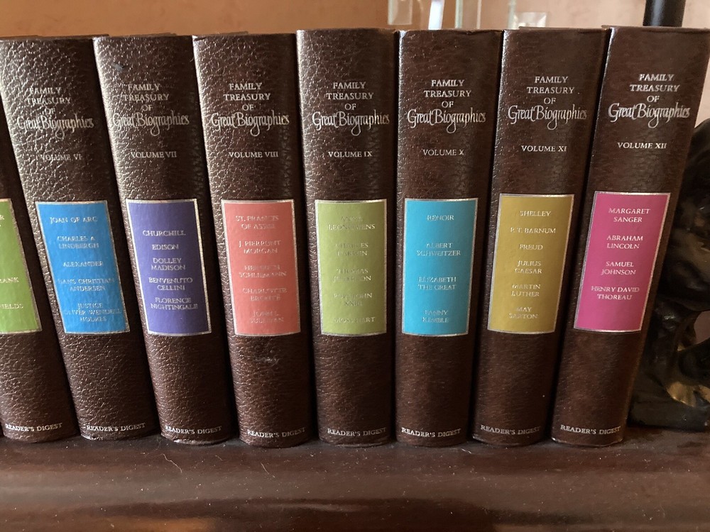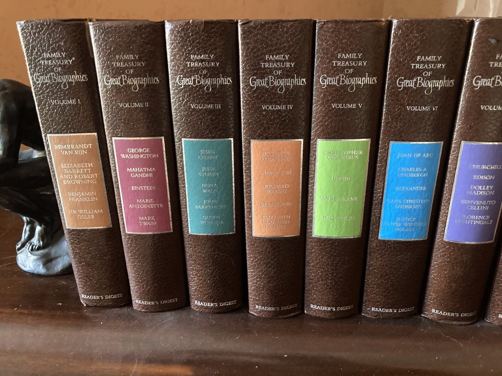 One complete 12 volume set of 1970 first edition Readers Digest Family Treasury of Great Biographies. Never read to my knowledge. Mother-in-law purchased and they have been on the shelf ever since. Thus may have some dust on top and possible drying to to age. See photos for condition.