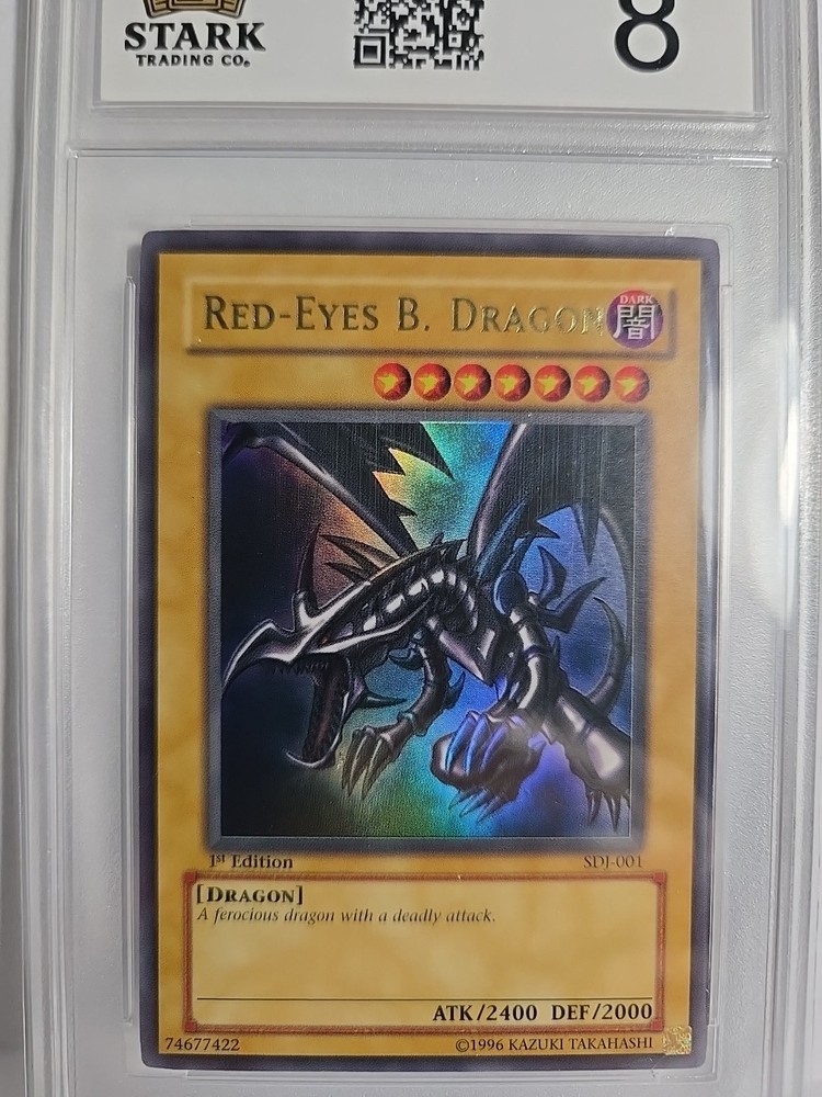 The product is a 1st Edition Red-Eyes B. Dragon card from the Starter Deck: Joey-1st Edition set, manufactured by Konami in 2003. This card is part of the Yu-Gi-Oh! TCG franchise and features the iconic character Red-Eyes B. Dragon, a dark attribute Dragon creature with 2400 attack power and 2000 defense. The card is made of standard card stock, has a holo finish, and is classified as an ultra rare collectible. It is a valuable addition to any Yu-Gi-Oh! card collection, especially for fans of the vintage game. This card in truly great condition minus the damage to the back, in a sleeve with a back it would look near perfect. Please see photos for best description.