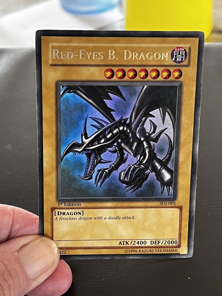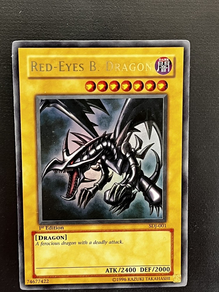 YuGiOh - Red Eyes B. Dragon SDJ-001 1st Edition - Ultra Rare - Lightly played INFORMATION -Please check the condition carefully as we have a no return/exchange policy. -Card will be sleeved and placed in a plastic top loader. -Will be shipped using USPS First Class. -Will be shipped in a 4x7 padded envelope. -Card is 100% authentic. -Does not include international shipping.