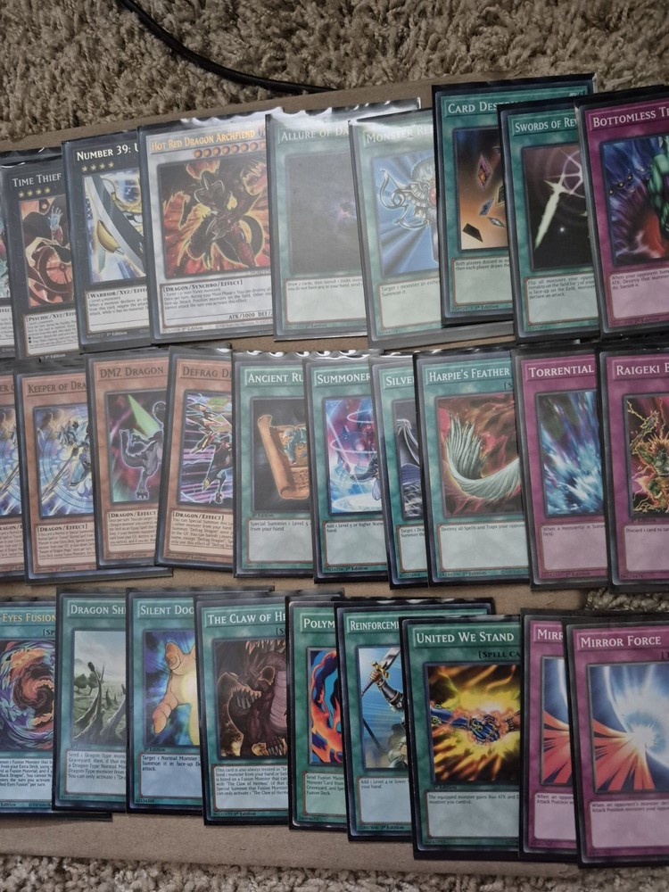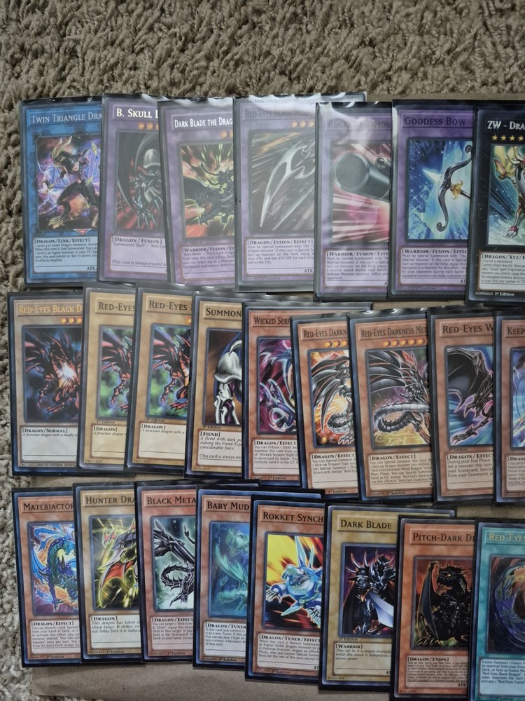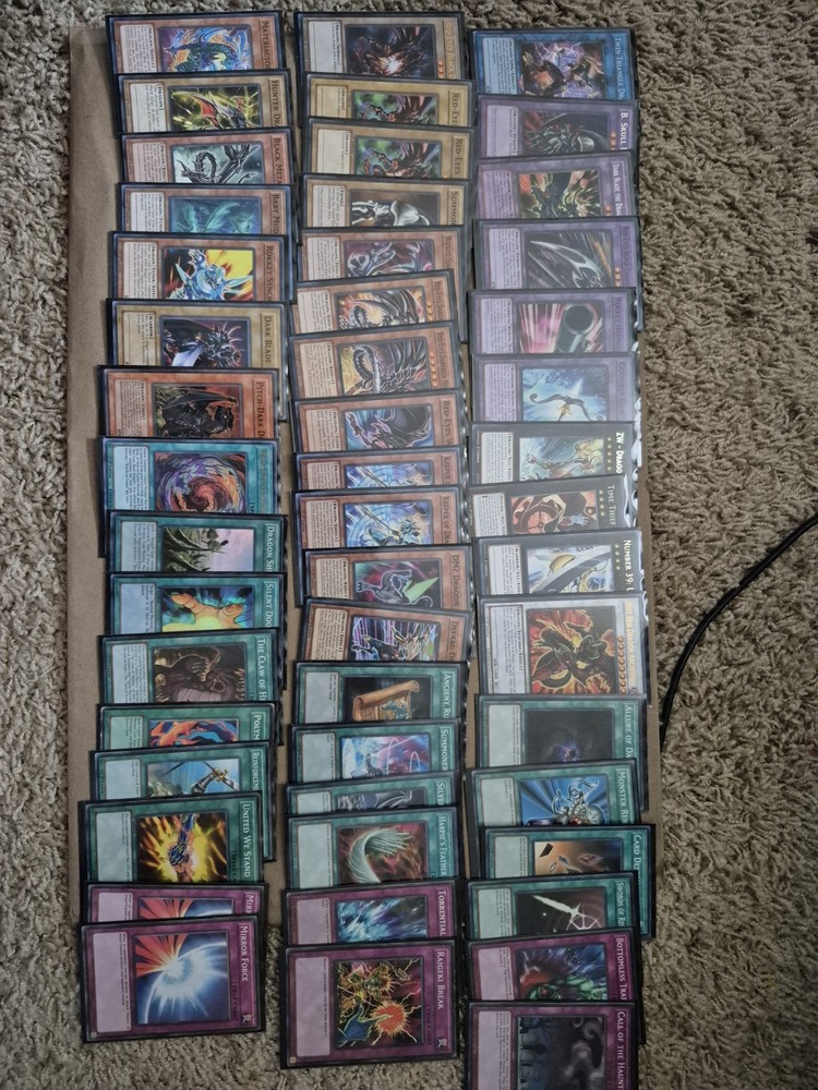 deck includes 5 fusions, 3 xyz, 1 link, 1 syncro, 19 monsters, 15 spells, 6 traps. some holos, mostly commons....