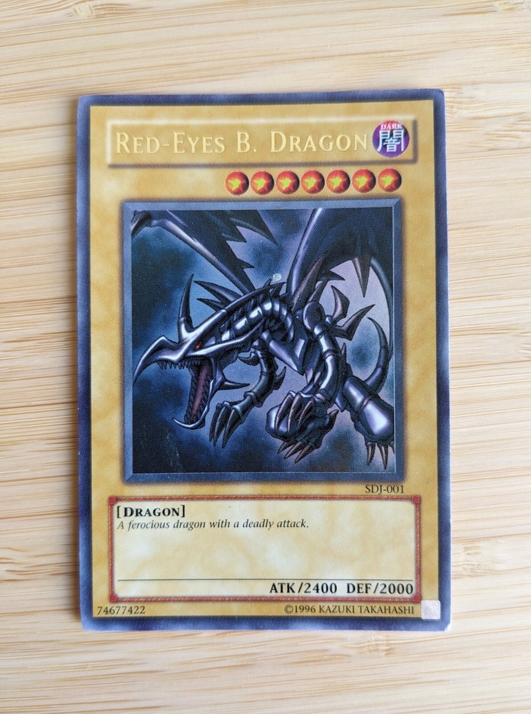 Red Eyes Black Dragon SDJ-001 Yu-gi-oh Card Ultra Rare LP. One corner has a slightly visible crease (see photo), that's hard to see on the front....