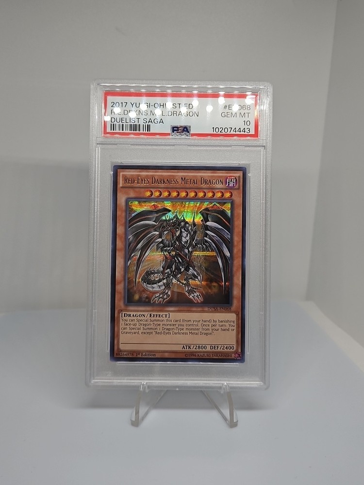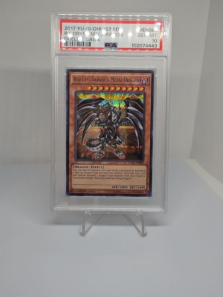 Elevate your Yu-Gi-Oh! TCG collection with the striking Red-Eyes Darkness Metal Dragon DUSA-EN068, a gem from the Duelist Saga set. This card showcases the enigmatic Joey Wheeler and features the mighty dragon creature type, rendered in exquisite foil finish that catches the light to bring the dark dragon to life. As a 1st Edition Ultra Rare, it's a must-have for both seasoned collectors and enthusiastic players. The Red-Eyes Darkness Metal Dragon boasts an impressive 2400 defense and 2800 attack, making it a formidable addition to any deck. It's been professionally graded by PSA with a perfect score of 10, ensuring its top-notch quality. This English-language card, manufactured in the United States, is free from autographs, keeping its focus purely on its striking design and metal craftsmanship.