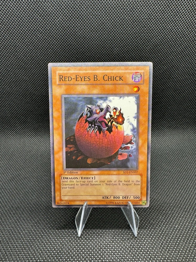 The Red-Eyes B. Chick SD1-EN007 Structure Deck: Dragon's Roar 1st Edition is a highly sought-after collectible card game item in the Yu-Gi-Oh! TCG universe. This dark attribute dragon-type card boasts a impressive defense of 500 and attack power of 800, making it a powerful addition to any deck. Manufactured by Konami, this common/short print card features unique 1st Edition print, and is a must-have for collectors and players alike. With its English language and effect card type, this rare card is sure to stand out in any collection.