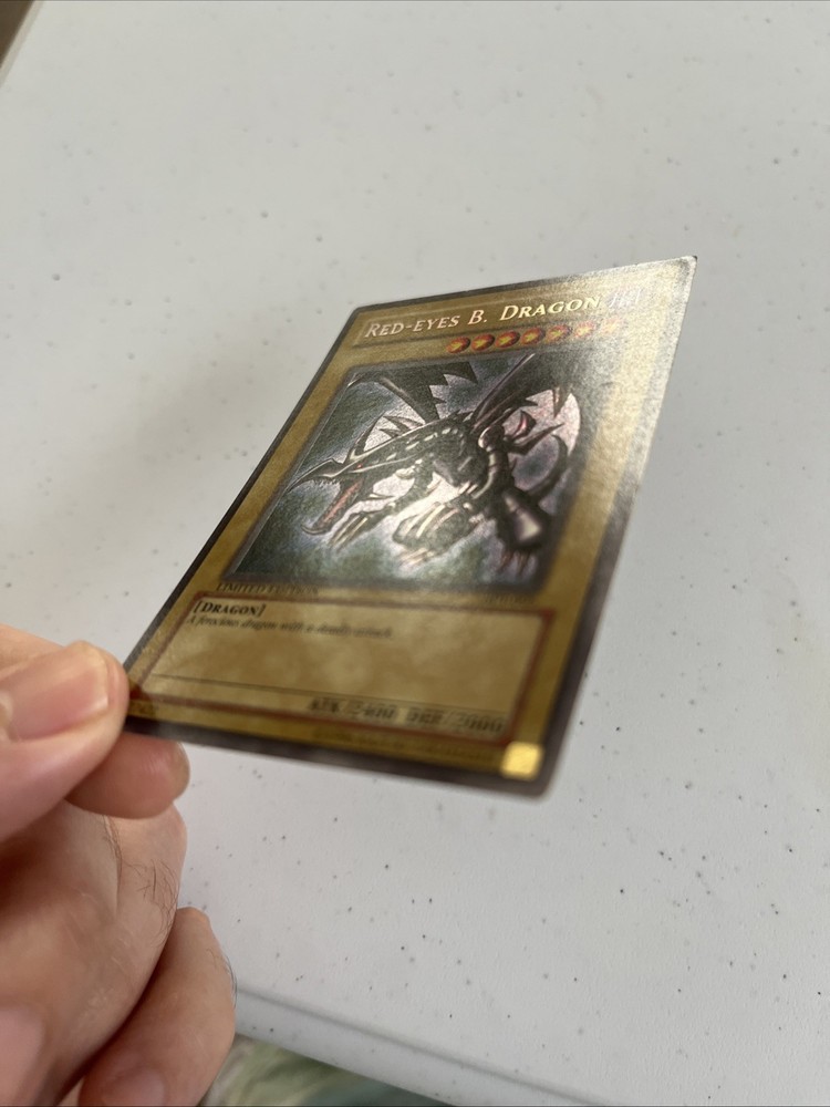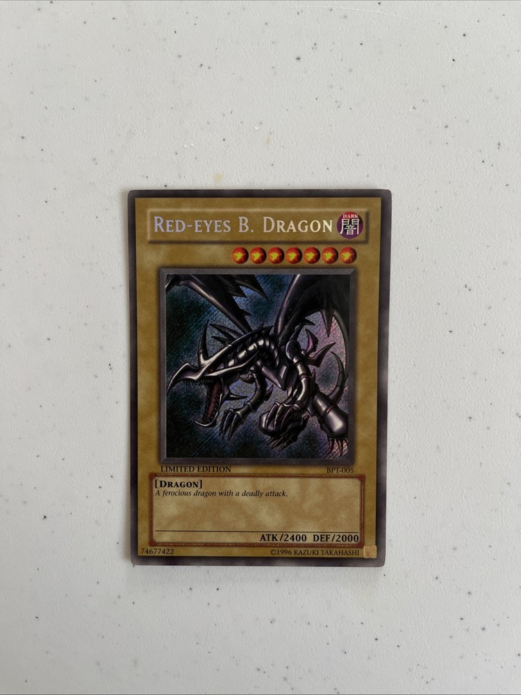 This is a limited edition Red-Eyes B. Dragon card from the 2002 Collector's Tin set of the Yu-Gi-Oh! Trading Card Game. It features the Dark attribute and has a defense/toughness of 2000 and an attack/power of 2400. The card is in English and has the card number BPT-005. This card is a Normal type and has the rarity of Secret Rare. It was manufactured by Konami and has a light played condition.
