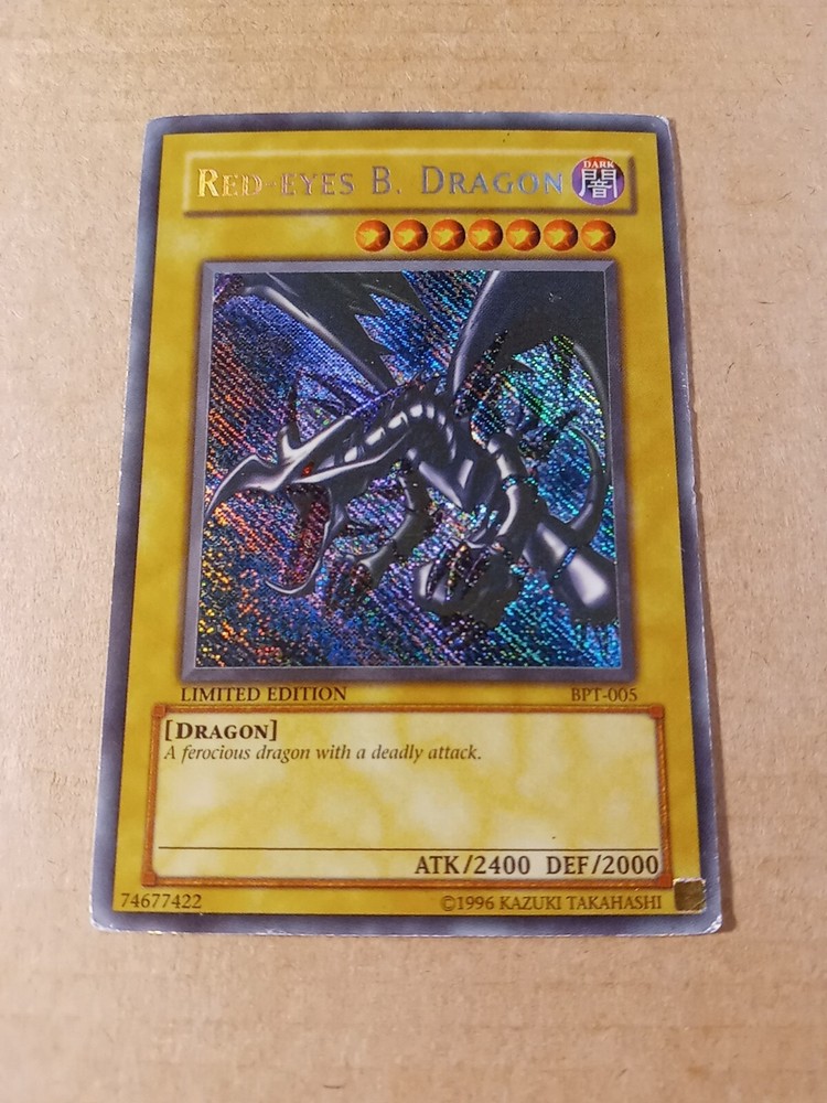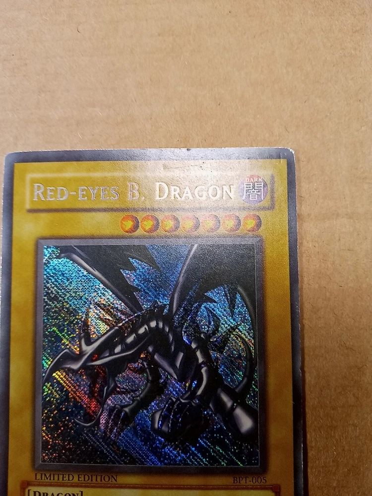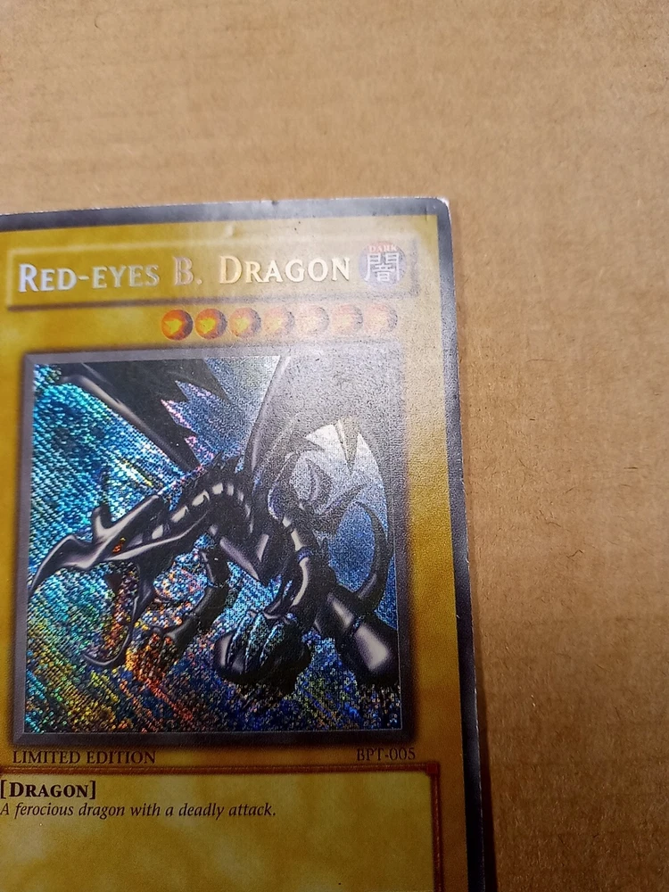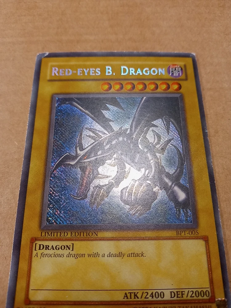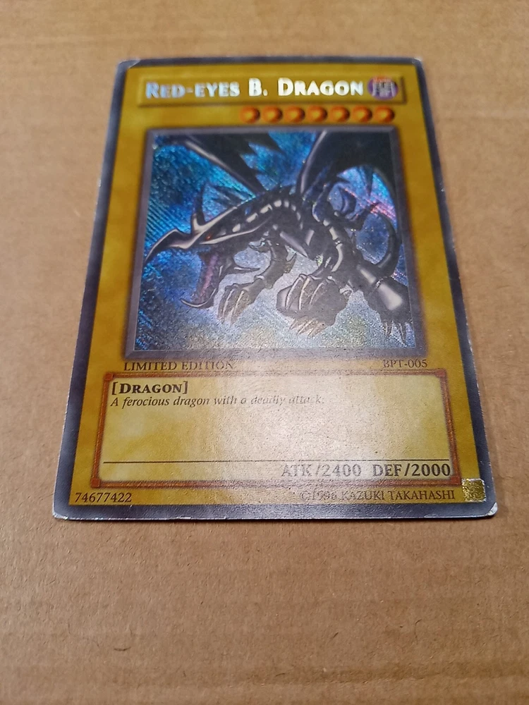 For sale is a Red-Eyes B. Dragon BPT-005 limited edition Secret Rare in Moderate Play to Heavy Play condition. This is the misprint version that has the secret rare foiling going the wrong direction down and to the right. Please see images provided as that will be exactly what you will receive. I have tried to highlight most if not all of the issues that I could find. The card definitely has some wear but still has it's integrity intact. The back is more worn than the front so I would say it has a moderate play front and a heavy play back. You can also see a crease from the back. Shop with confidence knowing that I try to provide detailed images of any issues that might exist. As a result, though, a lot of my images come out stronger than is usually the case in person in my strive to be transparent about what I am selling. Please refer to the first front and back images to see how the card more likely looks in person. And then see the pictures that follow with an obvious light glare to see defects made visible under a strong light. Ships within 3 business days. Best offers considered. Please do not submit a best offer unless you intend to follow through on the transaction. If an offer is accepted, all other interested parties/watchers cease when the listing ends and a buyer backing out after the fact costs sellers much more than just their time. Please note that all sales are final and returns are not accepted. If you have additional concerns or questions, please feel free to message me before purchasing. Please feel free to see my other listings to see what else I have for sale. I may have other listings of similar or the same card for sale. Starting this year, I will also be including a bonus item in all orders over $40. It will be a piece of kpop memorabilia with a personal favorite idol of mine just as a special way of saying "thank you" by providing what I hope will be a pleasant surprise. :) Thanks for looking!~