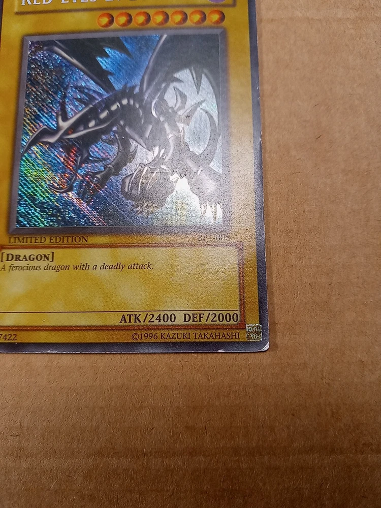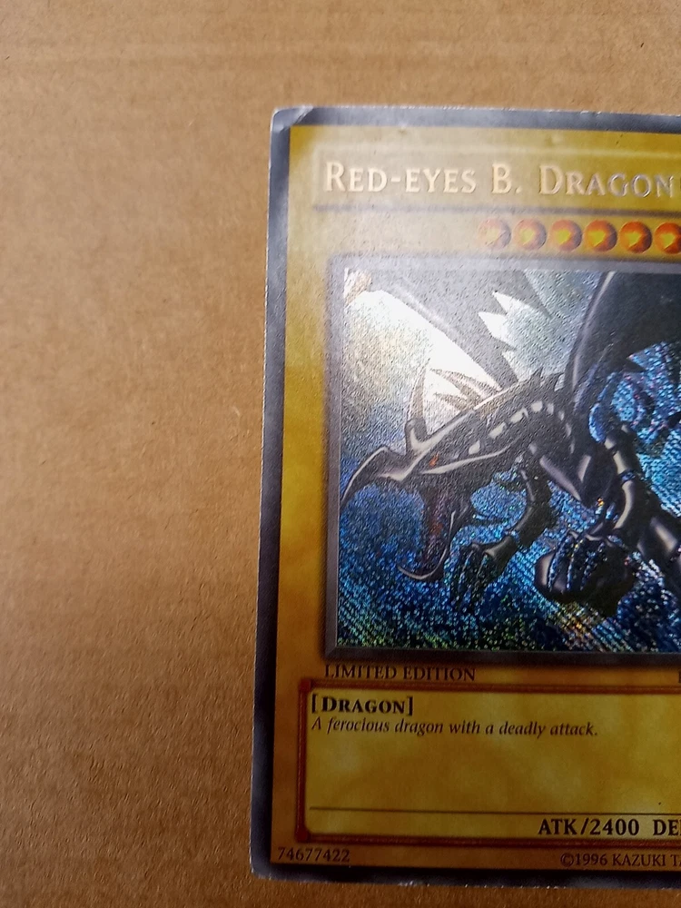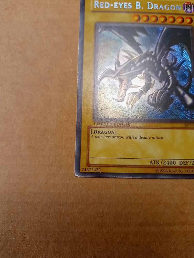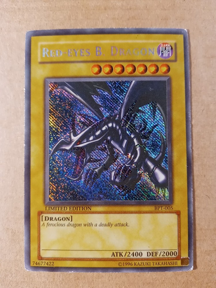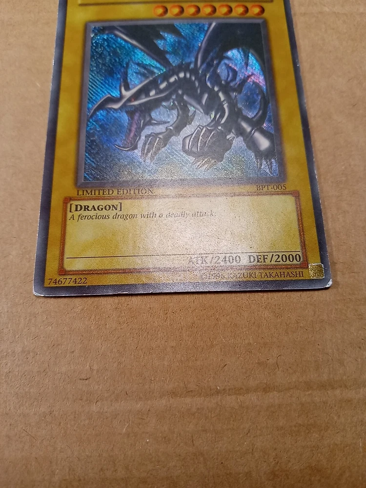 For sale is a Red-Eyes B. Dragon BPT-005 limited edition Secret Rare in Moderate Play to Heavy Play condition. This is the misprint version that has the secret rare foiling going the wrong direction down and to the right. Please see images provided as that will be exactly what you will receive. I have tried to highlight most if not all of the issues that I could find. The card definitely has some wear but still has it's integrity intact. The back is more worn than the front so I would say it has a moderate play front and a heavy play back. You can also see a crease from the back. Shop with confidence knowing that I try to provide detailed images of any issues that might exist. As a result, though, a lot of my images come out stronger than is usually the case in person in my strive to be transparent about what I am selling. Please refer to the first front and back images to see how the card more likely looks in person. And then see the pictures that follow with an obvious light glare to see defects made visible under a strong light. Ships within 3 business days. Best offers considered. Please do not submit a best offer unless you intend to follow through on the transaction. If an offer is accepted, all other interested parties/watchers cease when the listing ends and a buyer backing out after the fact costs sellers much more than just their time. Please note that all sales are final and returns are not accepted. If you have additional concerns or questions, please feel free to message me before purchasing. Please feel free to see my other listings to see what else I have for sale. I may have other listings of similar or the same card for sale. Starting this year, I will also be including a bonus item in all orders over $40. It will be a piece of kpop memorabilia with a personal favorite idol of mine just as a special way of saying "thank you" by providing what I hope will be a pleasant surprise. :) Thanks for looking!~