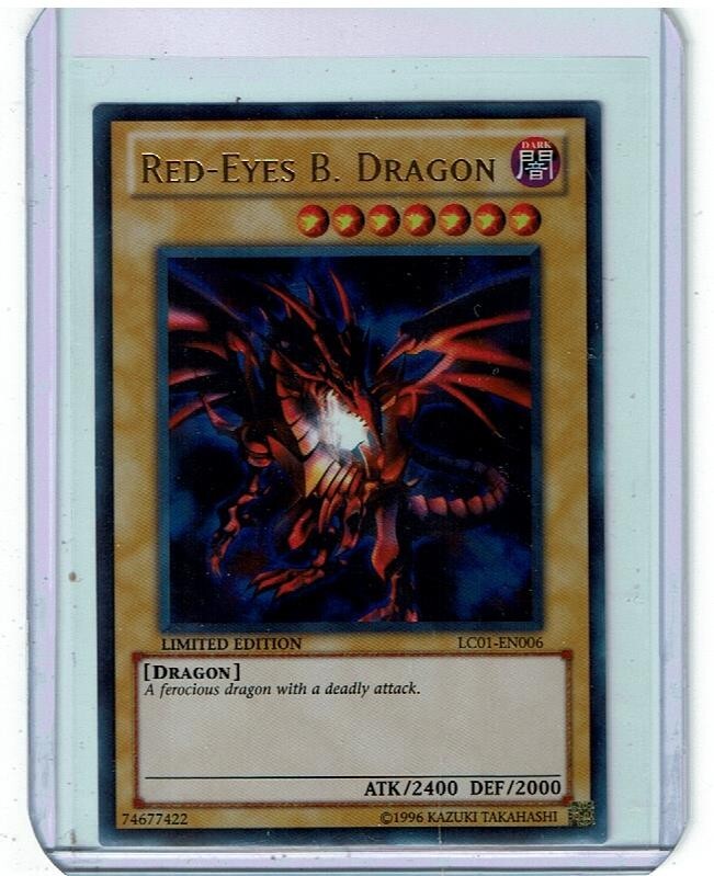 You are bidding on one, Red-Eyes B Dragon, Holographic, Yu-Gi-Oh card. Card is near mint. Card number YSYR-EN001. I have been selling on ebay since 2002 and have over 10,000 positive feedbacks, so bid with confidence. Immediate payment is required. When you receive your card, please take a minute and leave feedback for me so I know you have received your card. I have an automated system that will then leave feedback for you. Prices do fluctuate, so if you see something in my store you are interested in, and the price seems off, feel free to message me and I will check what the card has been selling for over the last 30 days or so. I cannot guarantee I will change the price, but I will check it. Also, due to the costs involved with selling on ebay, and offering free shipping, no card will be sold for less than 1.50. SHIPPING COSTS are FREE All items are shipped within 24 hours of receipt of payment. PLEASE NOTE!!!!! If you have bought more than one card and are paying with Paypal, please send ONE payment for the total amount. If you do not know the total amount or are having any trouble, feel free to e-mail us for your total. Please feel free to e-mail us with any questions you may have. If you do not see the specific card you are looking for please e-mail us a list of the cards you are looking for and we will try to fill your list for you. All lists are filled on a first come first filled basis. MOST cards will be sold at 50 percent of the Beckett Price Guide. Please e-mail us for prices on specific cards. Thanks for looking!!! Terry`s Card Shop
