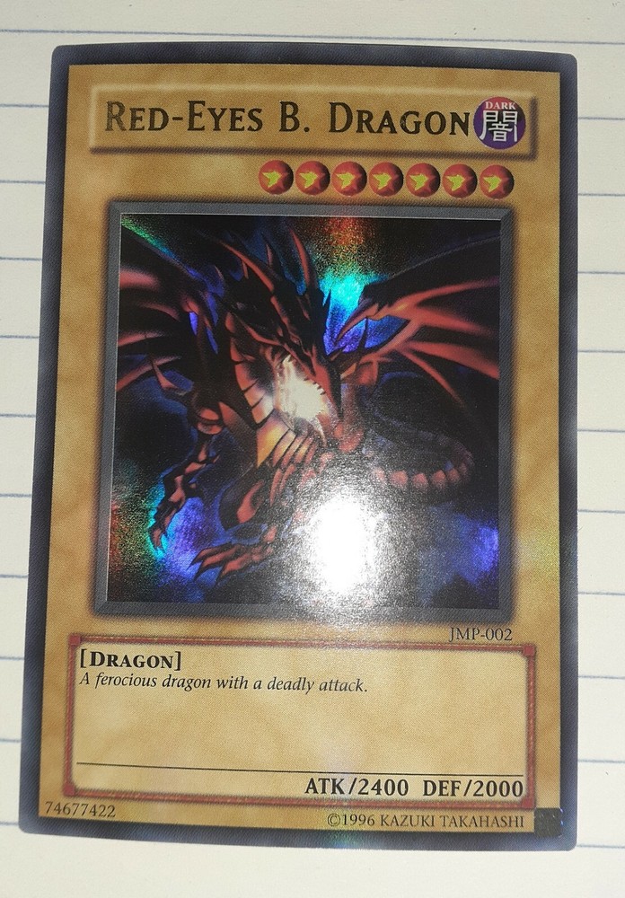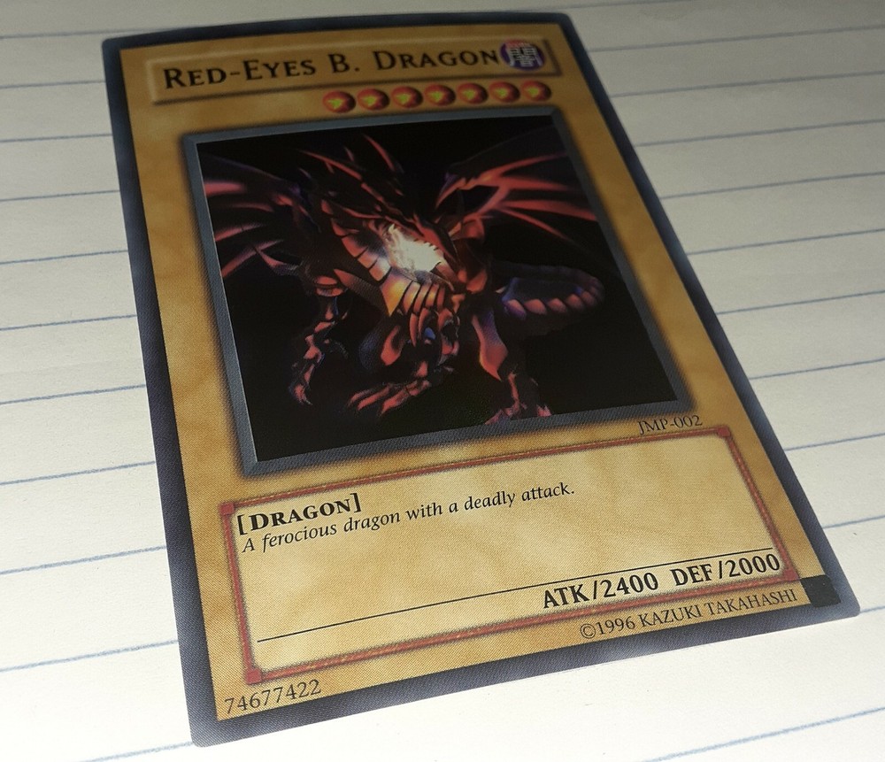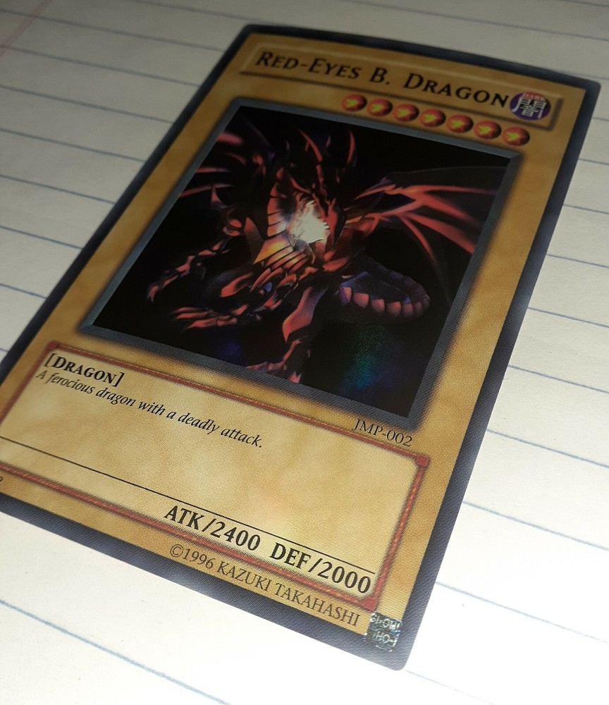 Red-Eyes B. Dragon JMP-002 ULTRA RARE Shonen Jump Comic Edition. This is a very special card that ONLY came with the Shonen Jump magazine subscriptions. This is the first that Red-Eyes was shown with this illustration as well. In this particular example you will notice the crispness of it. Like it just came out of the magazine. Can't find a blemish to note. An absolute survivor, and a great collectors piece!