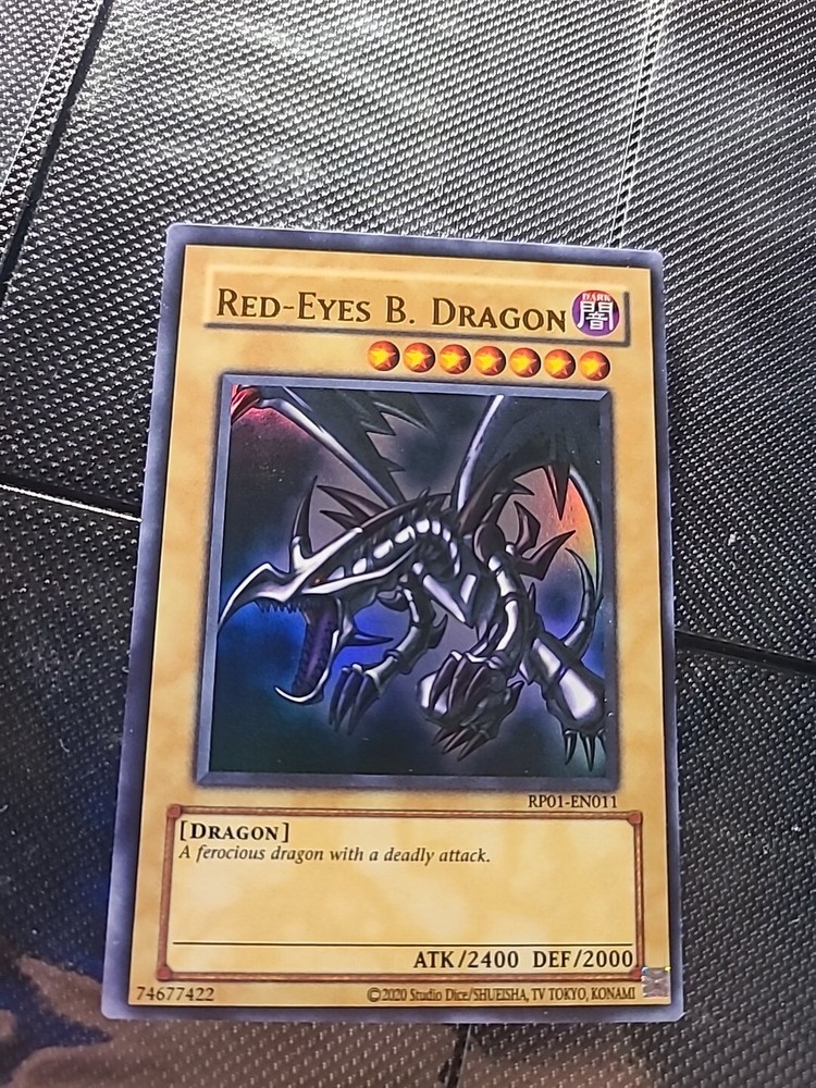 This rare and highly sought-after Red-Eyes B. Dragon card from the Yu-Gi-Oh! TCG game features a dark color attribute, 2400 attack power, and 2000 defense/toughness. It is an ultra rare card with unlimited features and a normal card type, belonging to the Retro Pack set and having the card number RP01-EN011. This card is perfect for collectors and players alike, and its unique lower text misprint/border shift misprint adds to its rarity and value. Don't miss out on the opportunity to add this incredible card to your collection!