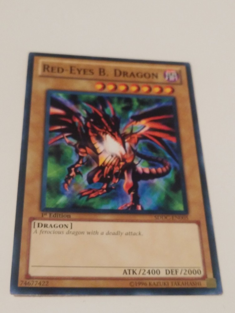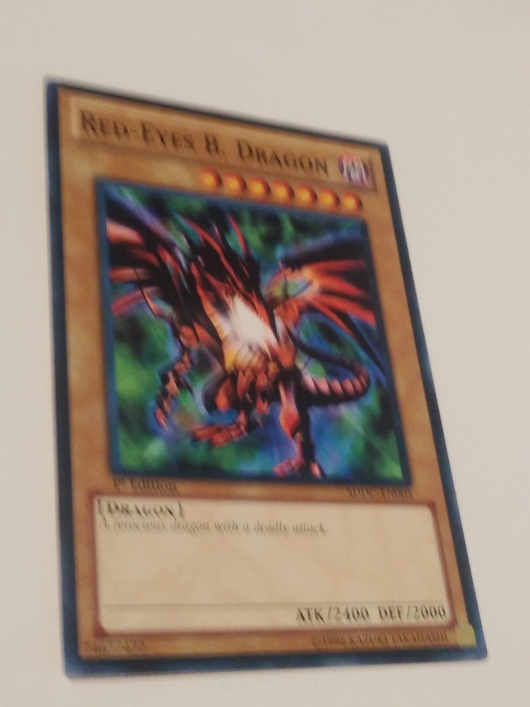 Red-Eyes B. Dragon SDDC-EN005 1st Edition Yugioh TCG Card The card is in excellent condition, my opinion is that it would grade around NM. Please see all photos. This will make an excellent addition to any collection. _________________________________________ **Note** - We source our items from a wide variety of people and stores, and we do our absolute best to describe each and every item for sale perfectly, but we CAN NOT confirm that every item is from a Pet-Free or Smoke-free home. We offer returns on almost all items, so buy with confidence, but realize that any particular item may or may not have an odor of smoke or pets. Scents are subjective, and what might irritate one person might be unnoticeable / has no affect on others. If there are any problems or issues, we will gladly work with the buyer, so please contact us immediately and we will do our best to address any needs or concerns. Please voice any concerns before leaving feedback. Shipping Policies - We strive to offer the most competitive shipping costs to allow our buyers to have the best service for the price. We do not add any handling charges or pad shipping weight. Every item is expertly wrapped/packaged, and we use an abundance of care to ensure that no damage can occur to an item during shipping. We ship FAST. All items ship within the next business day after payment is received, and very often we ship the same day as the purchase is made (generally if the purchase happens before 2PM EST, it ships that day). While not always possible, we can combine shipping to save on multiple purchases, but this must be requested BEFORE purchase (sometimes combining shipping actually costs more than shipping multiple items individually, due to package sizes). Currently we only use Ebay's Global Shipping Program to ship internationally. General Packaging Practices - As stated above in the "Note" section, we take extreme care when wrapping items. Almost all items get bubble wrapped (even non-fragiles) before being packaged. All trading cards ship in a top loader for protection and most cards are placed in sleeves beforehand. Cards under twenty dollars are generally shipped in a first class envelope. Cards priced above that amount are usually bubble wrapped and shipped in a poly-mailer style envelope. Comic Books are generally boarded and bagged for protection during shipping, and most times the comic is placed between 2 pieces of rigid cardboard for additional protection. Comic books over $50 usually also get shipped in a cardboard box (similar to a GeminI mailer). Grading - We are not professional graders of anything, but we strive to give an accurate & realistic grade to items when we do give our opinion. Most items that we sell do not need a grade but we do give our grading opinion on many comic books, trading cards, and occassionaly magazines. We use the most current guide books and internet resources to help differentiate between grades. Our comic grading is based on Overstreet guidelines. Since grading is subjective, your opinion might differ from ours, but we have had absolutely no complaints about grading, check our feedback! If you see an item that you would like to purchase and it is not graded, feel free to message us to see if we can give you our opinion. P.S. - Please be sure to ask any questions before purchasing. We are super-friendly, and extremely knowledgeable in the field of toys and many other collectibles, so please feel free to message any time!! Thank you for looking, stay safe out there, and have a great day!