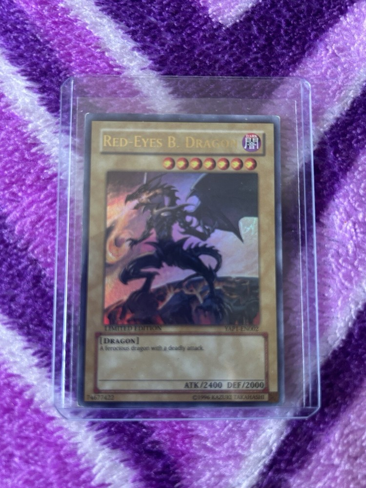 This limited edition Red-Eyes B. Dragon card from the Yu-Gi-Oh! TCG is a must-have for collectors and fans alike. With a dark color attribute and dragon creature type, this ultra rare card boasts 2400 attack power and 2000 defense/toughness. The card number is YAP1-EN002 and it is in English language.Manufactured by Konami, this normal card is part of the Anniversary Pack set and has a unique set of features. It is a great addition to any collection and is sure to impress. Get your hands on this rare card today!