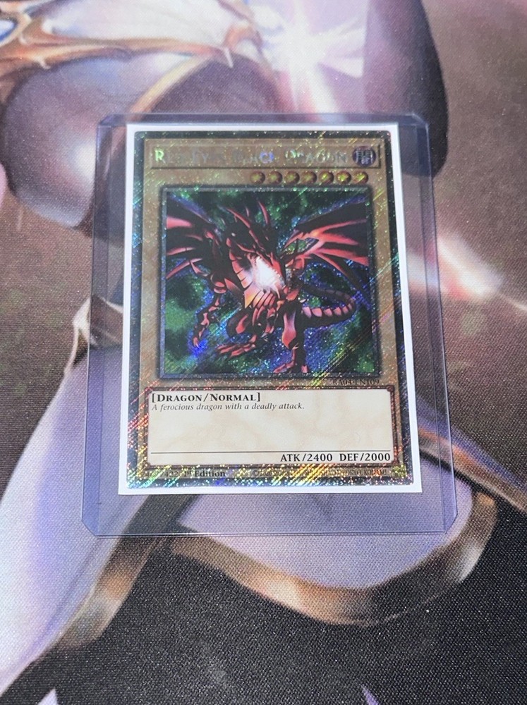 The Red-Eyes Black Dragon 1st Edition Platinum Secret Rare card from the Quarter Century Stampede set is a highly sought-after collectible in the Yu-Gi-Oh! TCG world. Manufactured by Konami in the United States, this Japanese-sized card features a holographic finish and is part of the Darkness attribute. With its rarity and special features, this English-language card is a valuable addition to any card collection for fans and collectors alike.