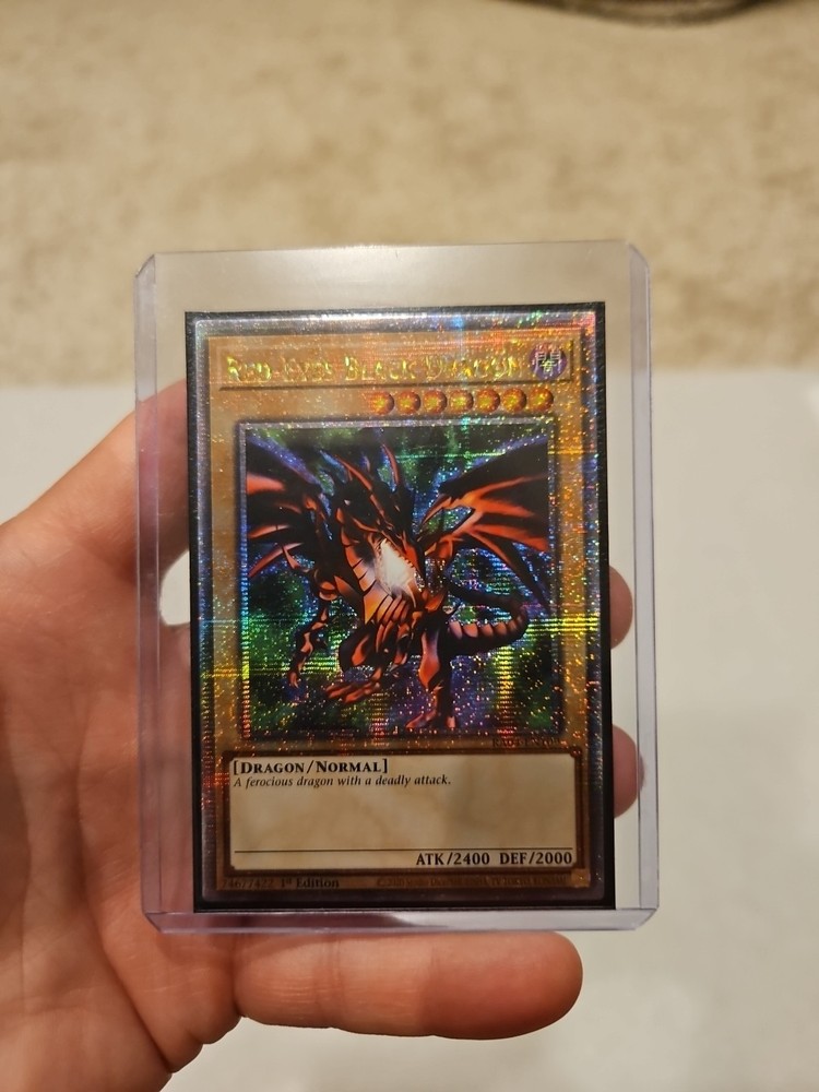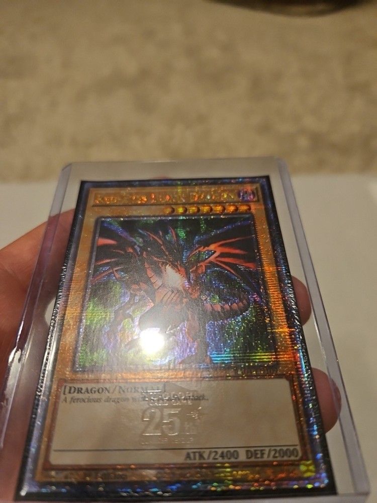 The Red-Eyes Black Dragon (4th Art) (Quarter Century Secret Rare) RA04-EN109 1st Ed. card is a highly sought-after collectible in the Yu-Gi-Oh! TCG world. This Dark-type Dragon card with an impressive 2400 attack power and 2000 defense, is a powerful addition to any deck. Manufactured by Konami and part of the Quarter Century Stampede set, this English-language card is a must-have for collectors and players alike. The 1st Edition status and near mint or better condition make this card a valuable and desirable item for any Yu-Gi-Oh! enthusiast.