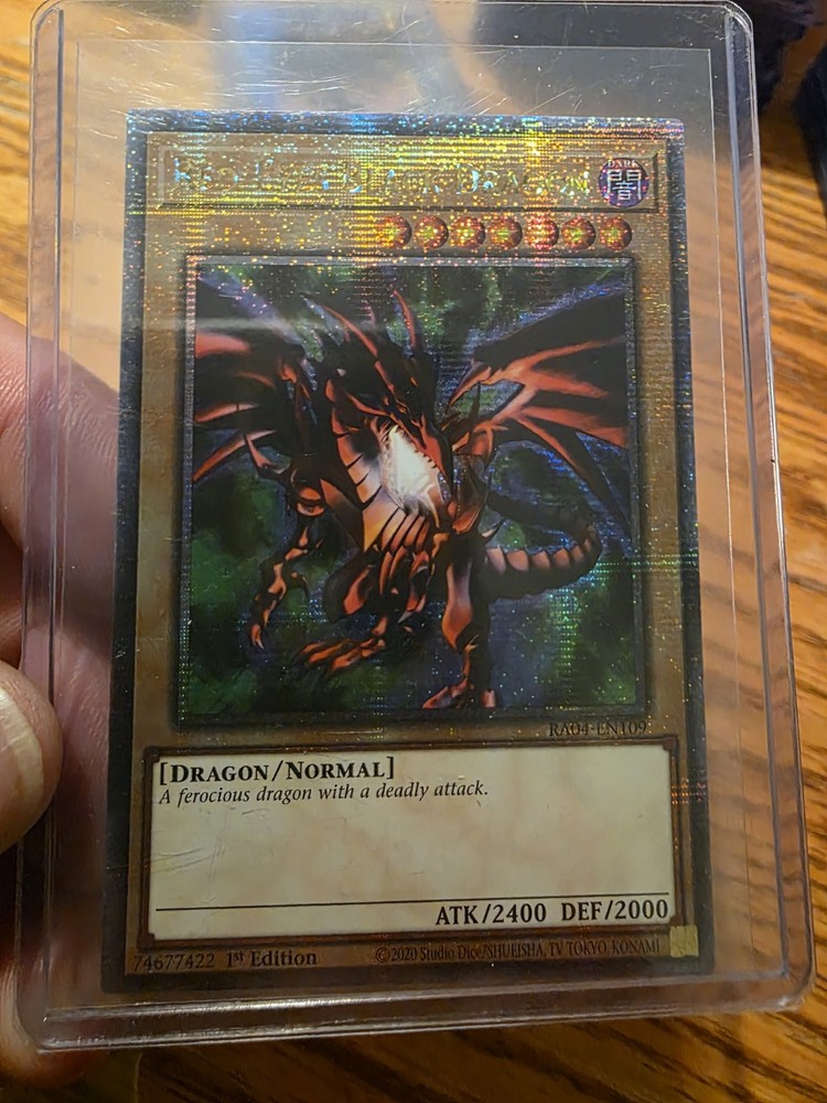 The Red-Eyes Black Dragon (4th Art) (Quarter Century Secret Rare) RA04-EN109 is a highly sought-after collectible card in the Yu-Gi-Oh! TCG. This Dark Dragon type card boasts an impressive 2000 Defense/Toughness and 2400 Attack/Power, making it a formidable addition to any deck. Manufactured by Konami, this 1st Edition card from the Quarter Century Stampede set is a must-have for collectors looking to celebrate the game's milestone anniversary. Its rarity and special features make it a valuable and unique addition to any card collection.