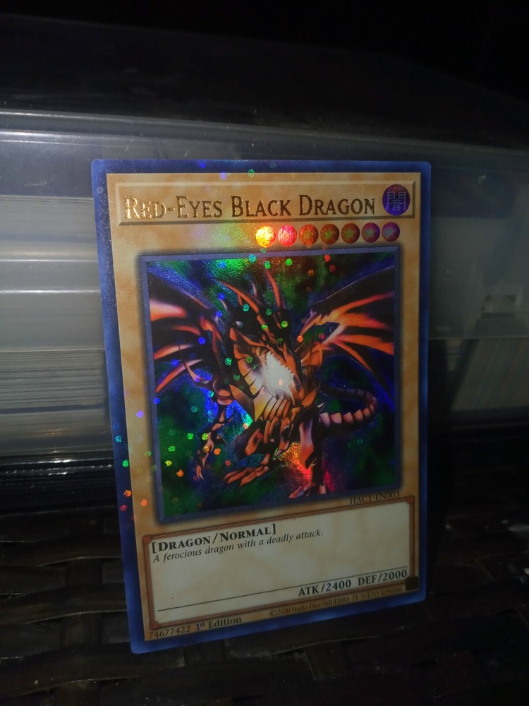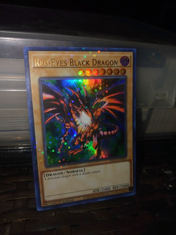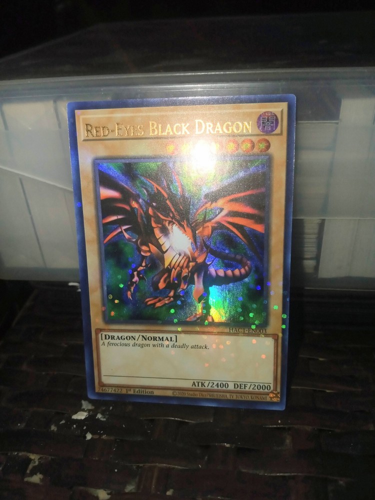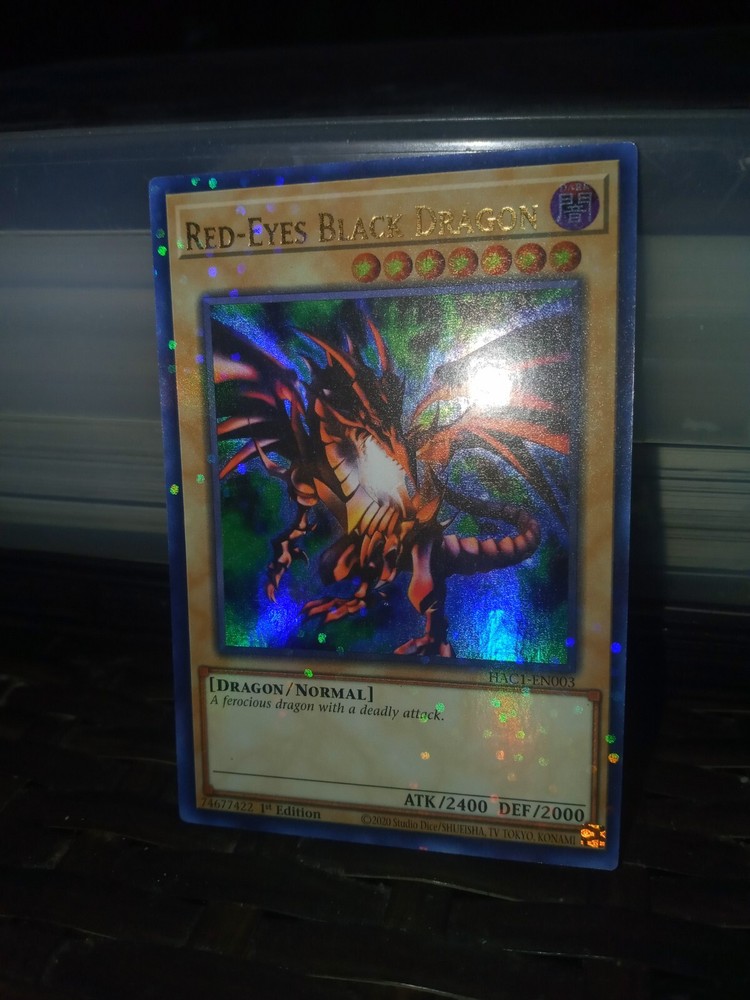 This Red-Eyes Black Dragon card is a must-have for any serious Yu-Gi-Oh! TCG collector. With a rarity level of Duel Terminal Technology Ultra Rare and a card number of HAC1-EN003, this card is sure to be a prized possession. The card features a dark colored dragon creature/monster type with 2000 defense/toughness and 2400 attack/power. The card is in English language and manufactured by Konami, with a 1st edition feature. This normal card type is from the Hidden Arsenal: Chapter 1 set and is perfect for adding to your collection or using in gameplay. Don't miss out on the opportunity to own this incredible card.