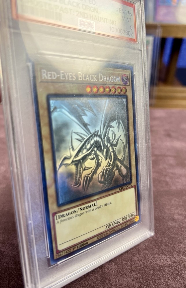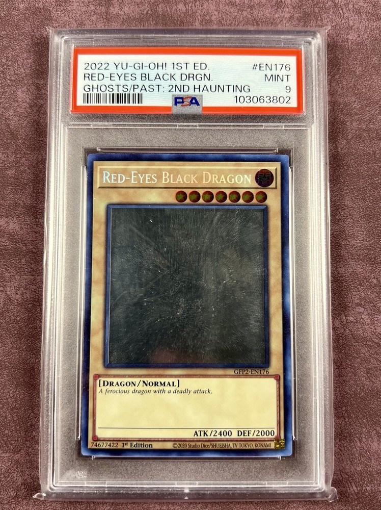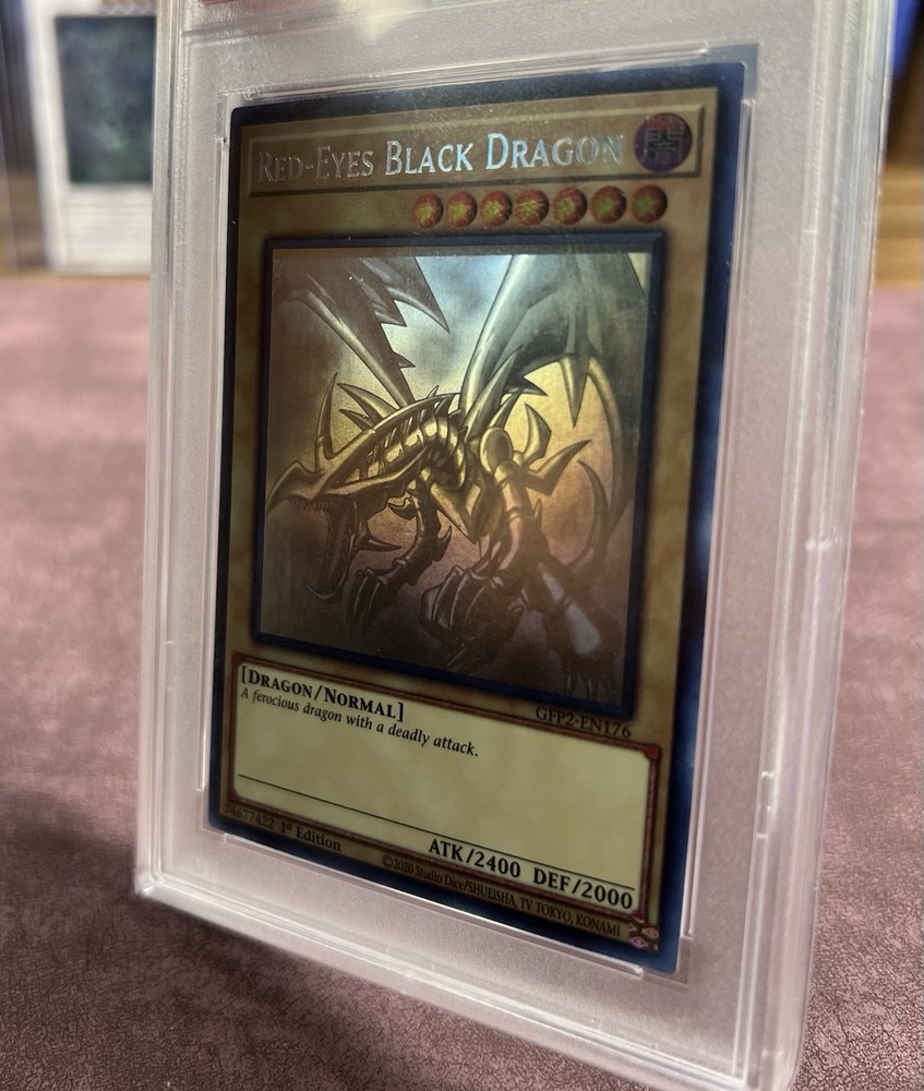 Red-Eyes Black Dragon card from the Yu-Gi-Oh! TCG, set "Ghosts from the Past: the 2nd Haunting". This is the Ghost Rare version of the card, numbered GFP2-EN176. It features a dark attribute and is a normal type card with 2000 defense/toughness and 2400 attack/power. The card is in English and has a 1st edition feature. The manufacturer is Konami.