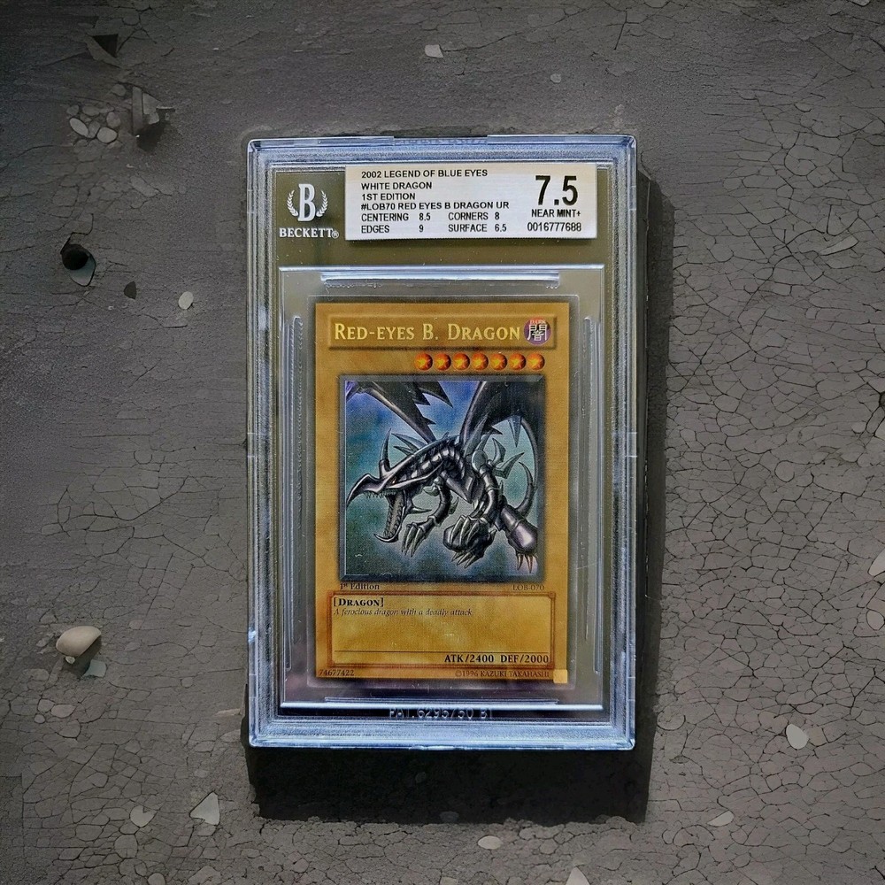 The Red-Eyes Black Dragon card from the Legend of Blue Eyes White Dragon set is a highly sought-after Ultra Rare 1st Edition card in the Yu-Gi-Oh! TCG. This English-language card features a Dark Attribute, Dragon Type, and has a special Legend character with Joey Wheeler. Graded by Beckett Grading Services (BGS) as 7.5, this Holo finished Monster Card with 2000 Defense and 2400 Attack power is a vintage collectible from the United States, making it a valuable addition to any collector's deck.