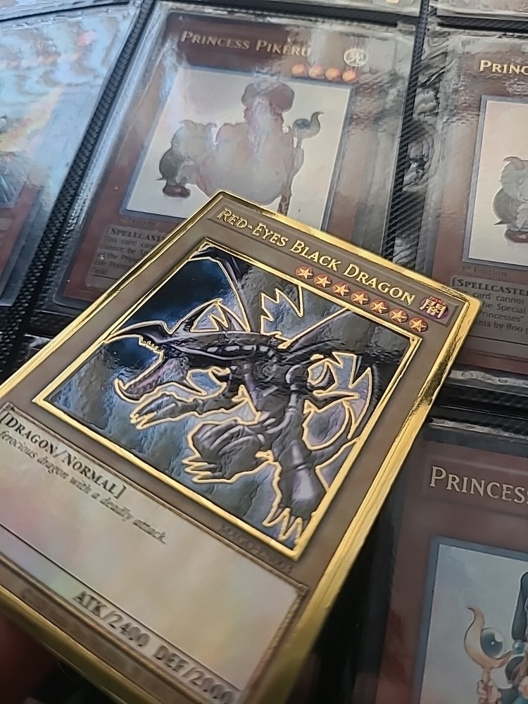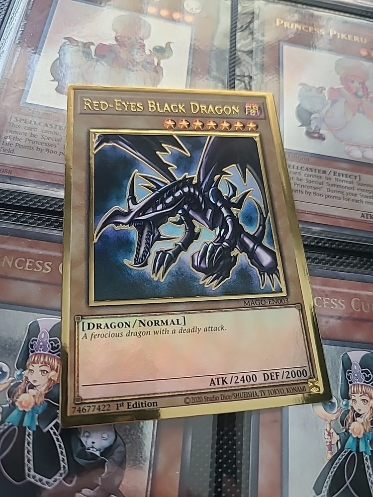 This is a rare and highly sought-after Red-Eyes Black Dragon card from the Yu-Gi-Oh! TCG. It features a stunning Japanese card size and is made of premium card stock material with a holographic finish. The card is from the Maximum Gold set and is a 1st Edition. The card has a dark attribute and is a dragon creature type with 2000 defense/toughness and 2400 attack/power. It is a premium gold rare card and has the card number MAGO-EN003. The card is in English language and was manufactured by Konami in the United States. Its illustrator is Kazuki Takahashi and it is suitable for ages 6+.