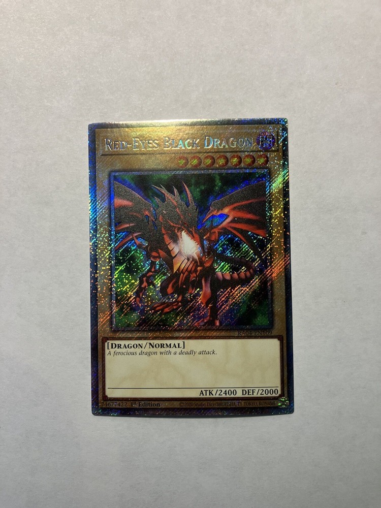The Red-Eyes Black Dragon RA04-EN109 Quarter Century Stampede Secret Rare card is a highly sought-after collectible in the Yu-Gi-Oh! TCG world. Manufactured by Konami in the United States, this dark attribute dragon card is made of high-quality card stock and features a striking design. With its rarity as a Secret Rare card from the Quarter Century Stampede set, this card is a valuable addition to any Yu-Gi-Oh! card collection. The card is not autographed but is signed by 5ban Graphics, adding a unique touch to this special edition release.