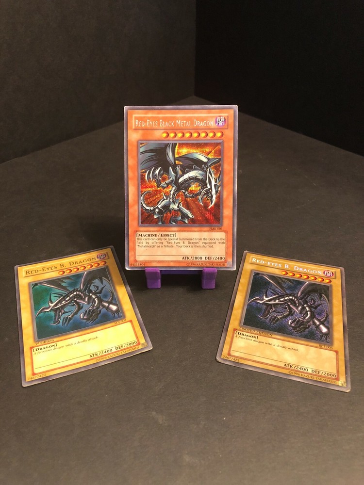3 Great collectors pieces for any Red Eyes B Dragon Collector! Everything included in this listing is as following: Red Eyes Black Metal Dragon (FMR-001) Prismatic Secret Rare Red Eyes B Dragon (SDJ-001) 1st Edition Holo Rare Red Eyes B Dragon (BPT-005) Limited Edition Prismatic Rare Thanks for looking! Logan, HeadStart Gallery