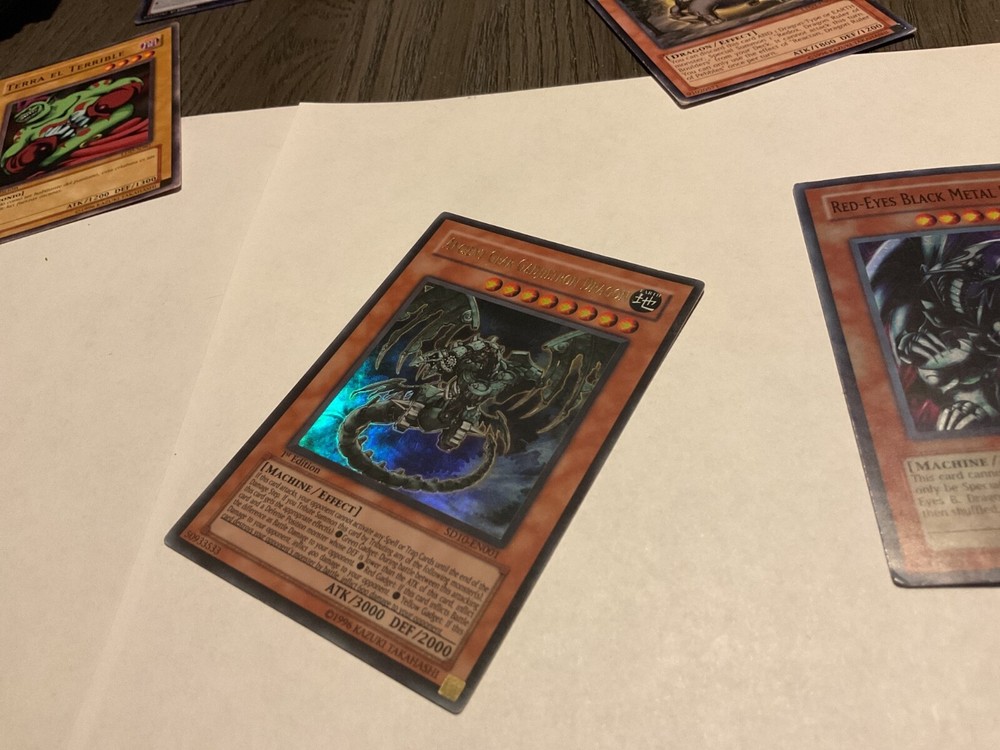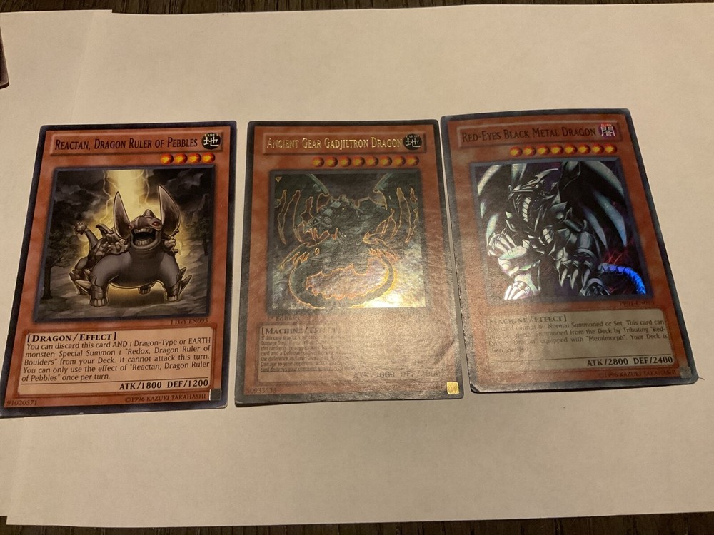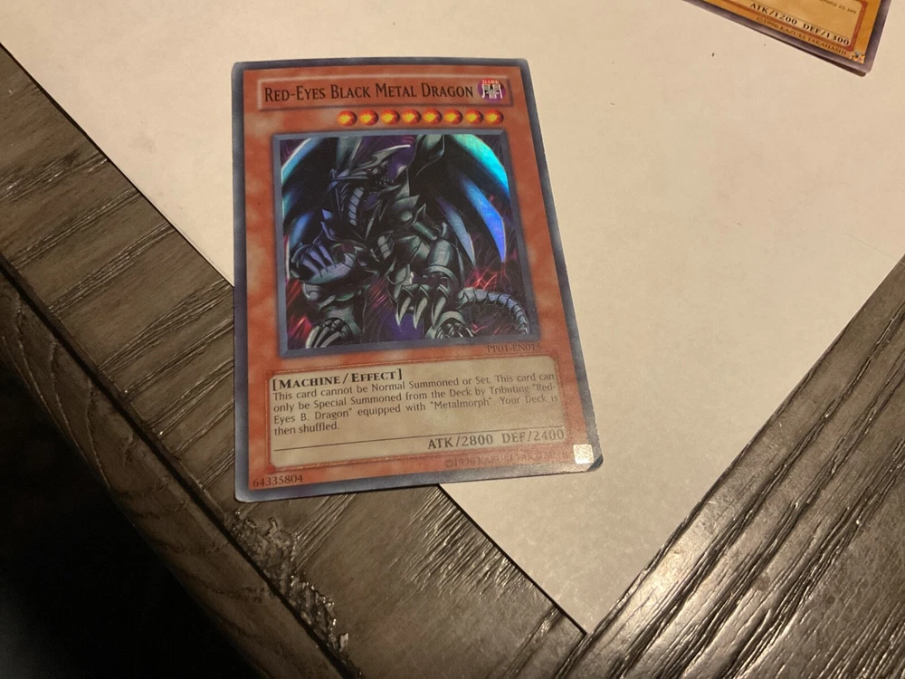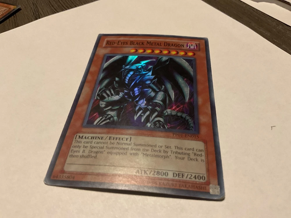 The Red-Eyes Black Metal Dragon PP01-EN015 is a Yu-Gi-Oh! TCG card from the Premium Pack 1 set. This Super Rare card features a Dark attribute with high stats such as 2400 Defense and 2800 Attack power. Manufactured by Konami, this English-language card is an Effect type with the unique ability to be played in Unlimited quantities. As a Machine creature type card, it is a valuable addition to any Yu-Gi-Oh! TCG collection for fans of collectible card games. Super rare card. Plus 2 more drag cards I don’t grade cards but imo: Ancient Gear…LP Reactan…….LP Red-Eyes Black Metal…..MP??