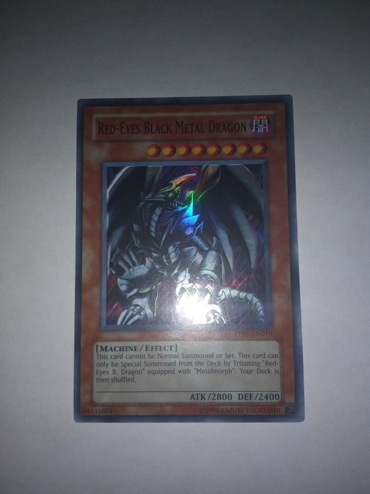 This Yu-Gi-Oh! card is a rare find for collectors and players alike. The Red-Eyes Black Metal Dragon, from the Yugi set, is a foil card. It is a super rare card, with a card number of PP01-EN015, and was manufactured by Konami in 2007. The card is a valuable addition to any collection. It is in excellent shape, with no blemishes or damage. This card is a must-have for any serious Yu-Gi-Oh! collector.