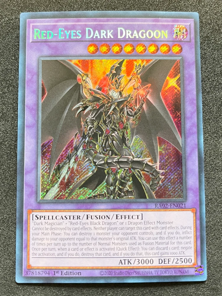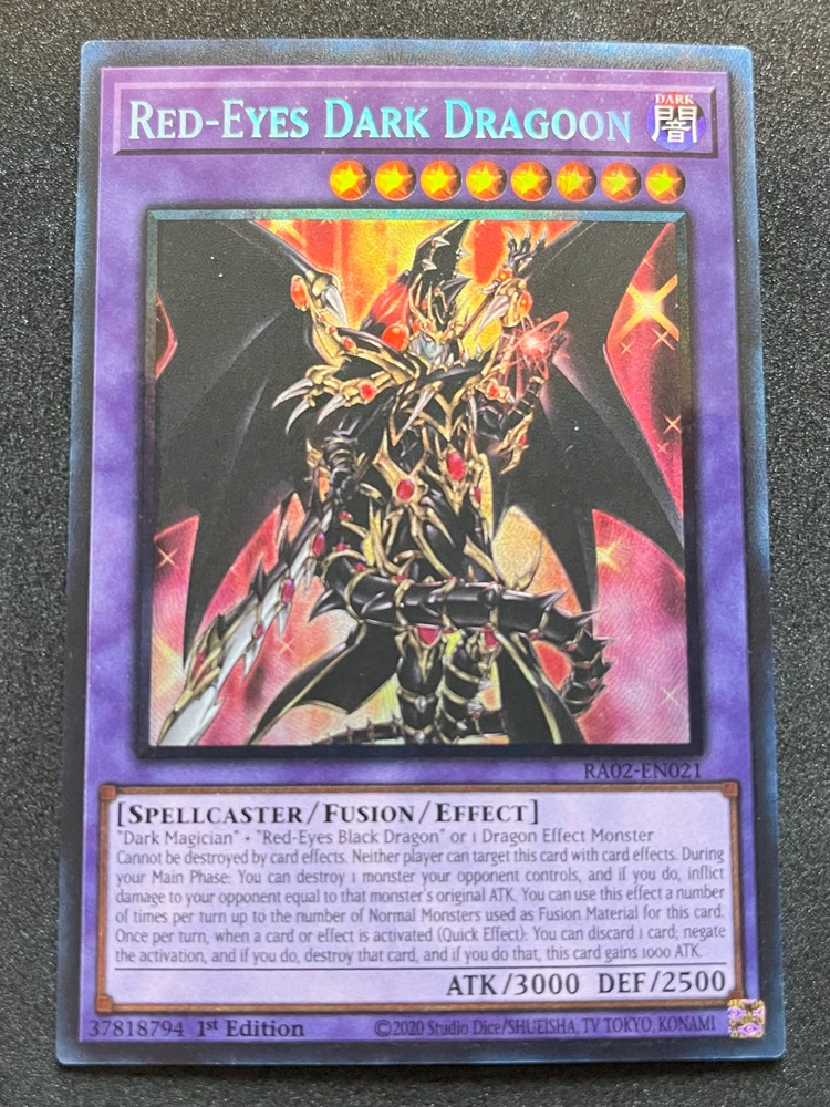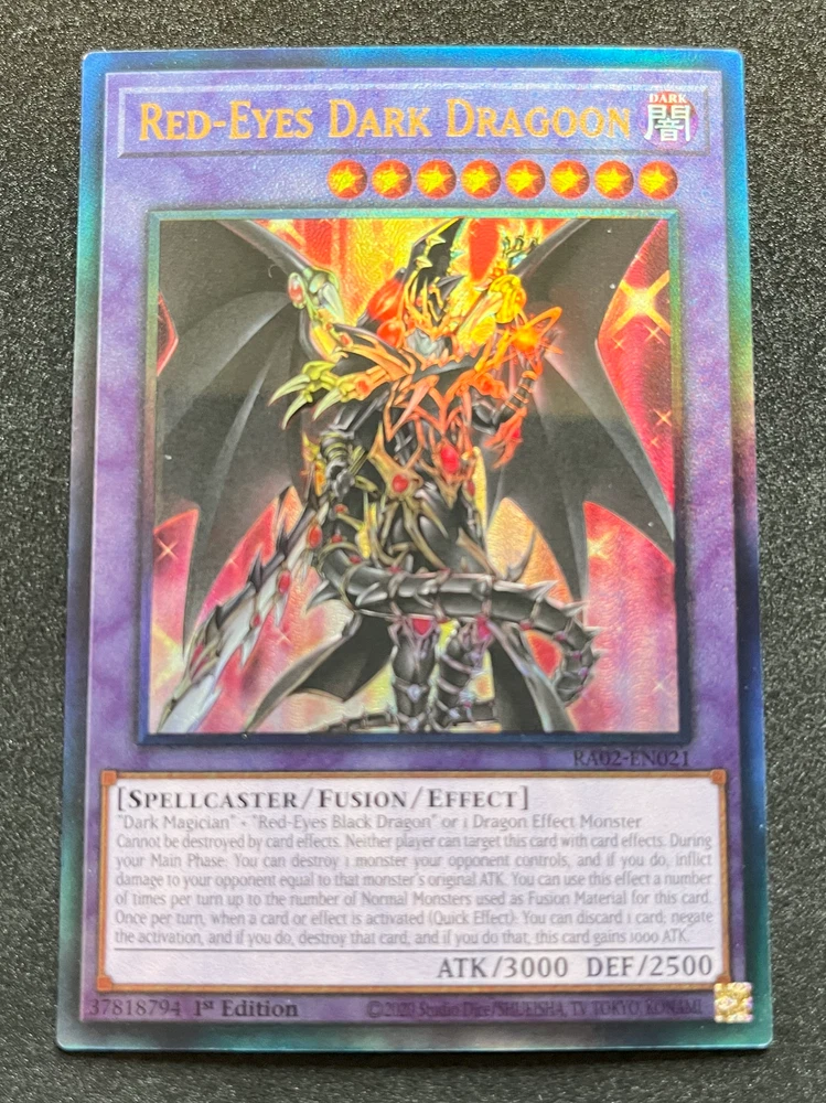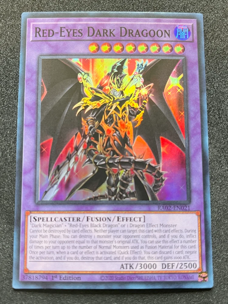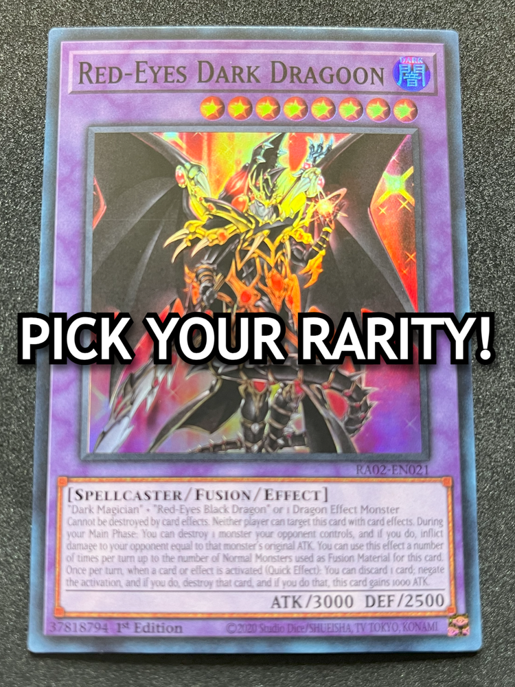This listing is for Red-Eyes Dark Dragoon - RA02-EN021 from the 25th Anniversary Rarity Collection II set . Each photo in this listing is a stock photo as this is a bulk variation listing. You will receive the same card in the same condition selected , but it may not be the exact copy from the photo . Each card will be in Near Mint condition. Cards in this listing may have some very minor imperfections (such as few small dots of whitening or a couple of very small scratches), but there will be no major damage to the cards (such as excessive whitening, scratches, edgewear, creases, water damage, etc). The cards from your order will be securely packaged in a card saver and card saver perfect fit sleeve and shipped with the eBay Standard Envelope program for cards under $20. Whether you're looking to power up your deck or add this to your collection, you'll be sure to enjoy this card! Check out our other listings for more Yu-Gi-Oh! cards!