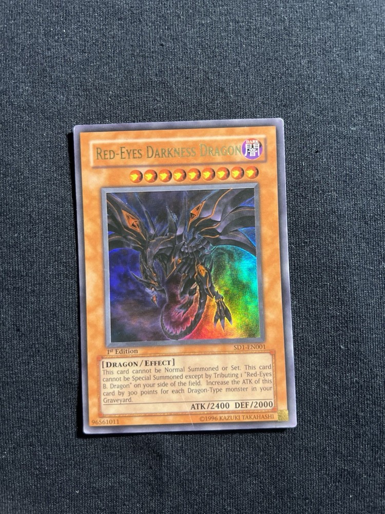 Unleash the power of the Red-Eyes Darkness Dragon SD1-EN001 from the Structure Deck: Dragon's Roar-1st Edition and elevate your Yu-Gi-Oh! TCG gameplay. As a coveted Ultra Rare card, it boasts an impressive 2000 Defense/Toughness and a striking 2400 Attack/Power, ensuring it can take on even the toughest of opponents. This Effect-type card, featuring the iconic Dark attribute, is a must-have for any serious player or collector. The card's unique 1st Edition status adds to its appeal, and with English language availability, it's ready to be a standout piece in your deck or display. Add this formidable creature to your arsenal and experience the might of the Red-Eyes Darkness Dragon.