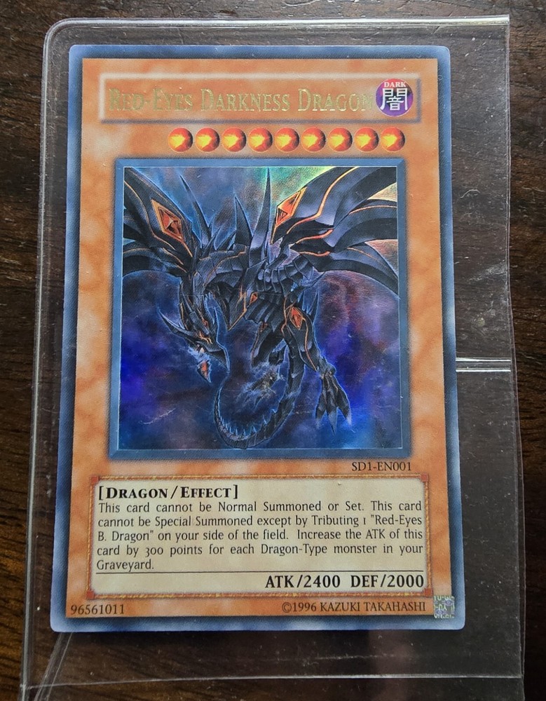 Red-Eyes Darkness Dragon - SD1-EN001 - Ultra Rare Unlimited Structure Deck: Dragon's Roar [SD1] Unlimited Singles - 0 Customer Reviews - Review This Product Rarity Ultra Rare Description Red-Eyes Darkness Dragon - SD1-EN001 - Ultra Rare Unlimited is a Yugioh Card (Unlimited) card from the Structure Deck: Dragon's Roar [SD1] Unlimited Singles Yugioh set. This is an Ultra Rare. Yugioh began back in the mid 90's as a weekly short in Shonen Jump by 1999 the TCG game had launched in Japan. Yugioh has gone on to become one of the top card games in the world and has now surpassed 20 years of competitive play worldwide. Additional Details: B0062DY9CO Dimensions 3.38" H x 2.31" W x 0.012" D Ship Weight 0.004 pounds $2.29 Qty: 1 0 Condition: Near Mint Unlimited English Yugioh Card