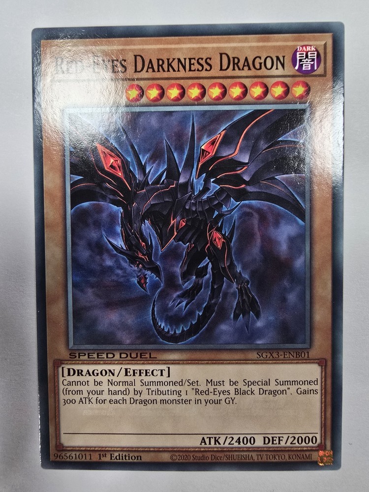 Please, carefully read the following: Image shown is a stock photo and does not reflect the actual card you will be receiving. Please refer to the condition guide below, the title and item description for what you will be receiving. Please also be aware that due to plastic shortages, orders may not always come in a plastic toploader but will always be protected as much as possible to prevent damage. You will receive 1x Red-Eyes Darkness Dragon - SGX3-ENB01 - Common - 1st Edition - Condition: Near Mint Please refer to the Title and Item Description above for the item being purchased. Delivery delays: Deliveries may not always fall within the estimated delivery dates when shipping outside of Canada and USA. Many factors may contribute to delays in delivering the package such as weather and customs. Please note that delivery to international locations may take up to 8 weeks to arrive . We always ship out orders within 1 business day and after dropping off with the post office, delivery times are out of our control. Feedback: We will always leave positive feedback for you and we ask if you can do the same for us. If there is any reason why the transaction was not up to your expectations, please message us before leaving feedback so we can address the issue. Combined shipping: To receive a combined shipping quote, please make sure that you commit to purchasing on ebay.ca . This allows us to send you a combined shipping invoice before payment. Shipping within the USA (6-10 Business days): FREE! Shipping within Canada (3-8 Business days): FREE! Shipping and handling delay: We aim to ship all orders within 1 business day. We do not ship on weekends and holidays. Condition Guide: We do not sell any cards that are in MINT condition, the best condition that we offer is near mint. Near Mint (NM) - Cards in Near Mint condition show minimal to no wear from shuffling, play or handling and can have a nearly unmarked surface, crisp corners and unblemished edges outside of a few minimal flaws. A Near Mint card may have a tiny edge nick or a tiny scratch or two, but overall look nearly unplayed with no major defects or flaws. Lightly Played (LP) - Cards in Lightly Played condition may have minor border or corner wear or even just slight scuffs or scratches. There are no major defects such as water damage, bends or issues with the structural integrity of the card. Noticeable imperfections are okay, but none should be too severe or at too high a volume. Moderately Played (MP) - Cards in Moderately Played condition exhibit condition issues visible at a casual glance. Cards in Moderately Played condition can have border wear, corner wear, scratching or scuffing, creases or whitening, minor dirt buildup or any combination of mild examples of these marks. A Moderately Played card may have some form of a more major marking, such as spot water damage or creasing that doesnʼt affect card integrity, but not in combination with other issues such as scratches, scuffs or border/edge wear and not impacting a large area of the card. Heavily Played (HP) - Cards in Heavily Played condition show a severe amount of wear. Heavily Played condition can include cards that have major creasing, major whitening, major border wear or any combination of those flaws. (These flaws cannot prevent the card from being tournament playable when sleeved.) Damaged - Cards in Damaged condition can exhibit a tear, bend or crease that may make the card illegal for tournament play, even in a sleeve. Cards in Damaged condition may have extreme border wear, extreme corner wear, heavy scratching or scuffing, folds, creases or tears or other damages that impacts the structural integrity of the card.