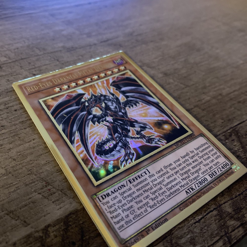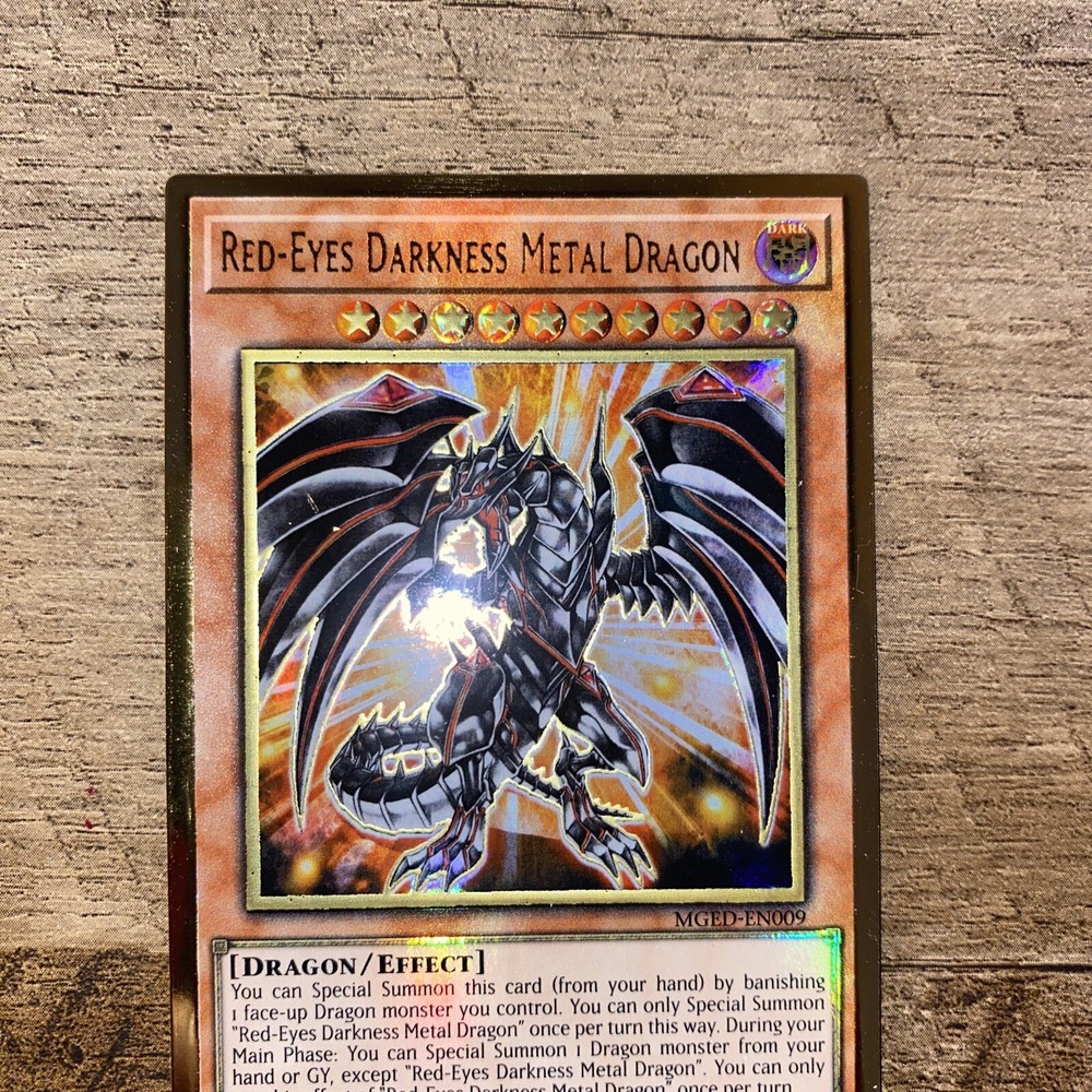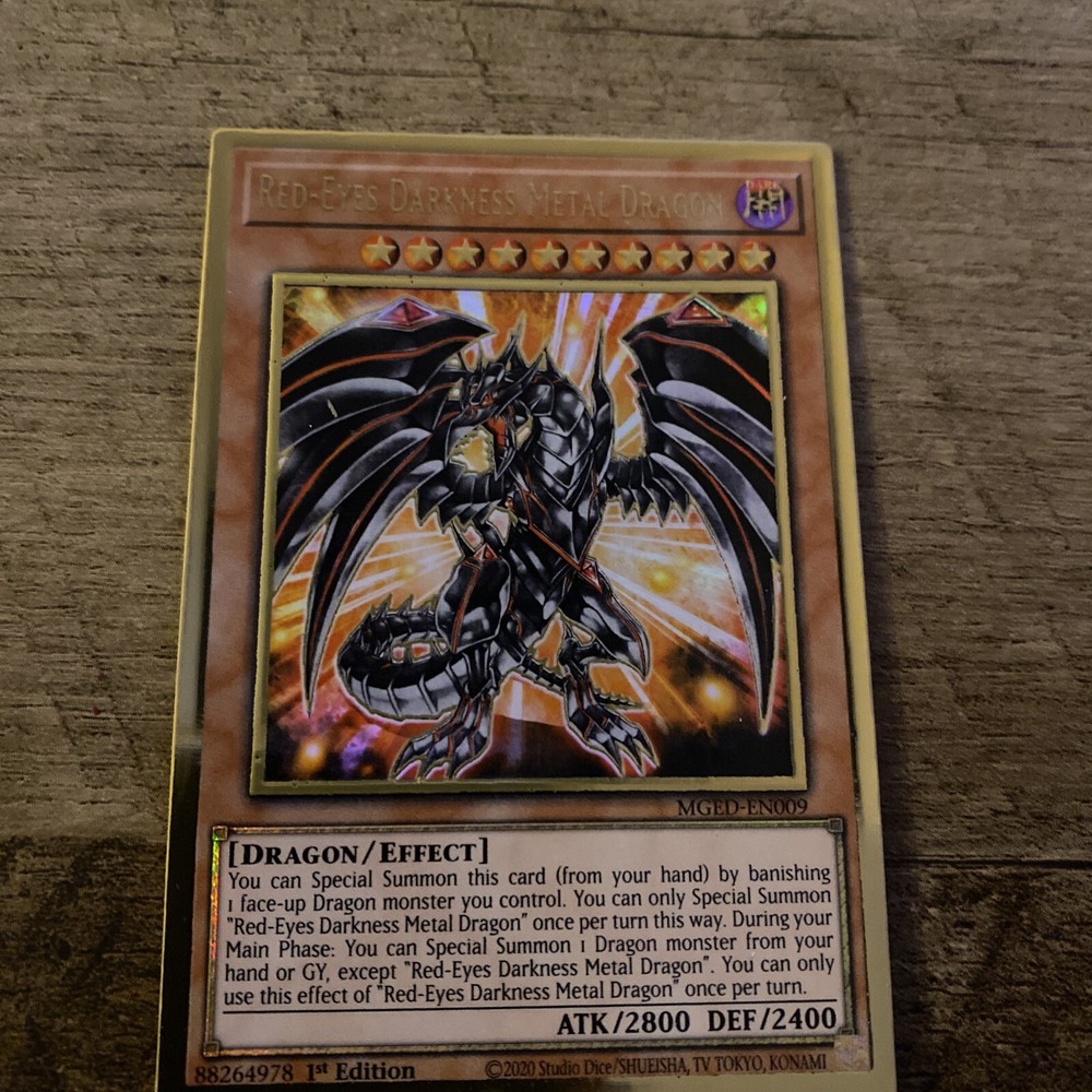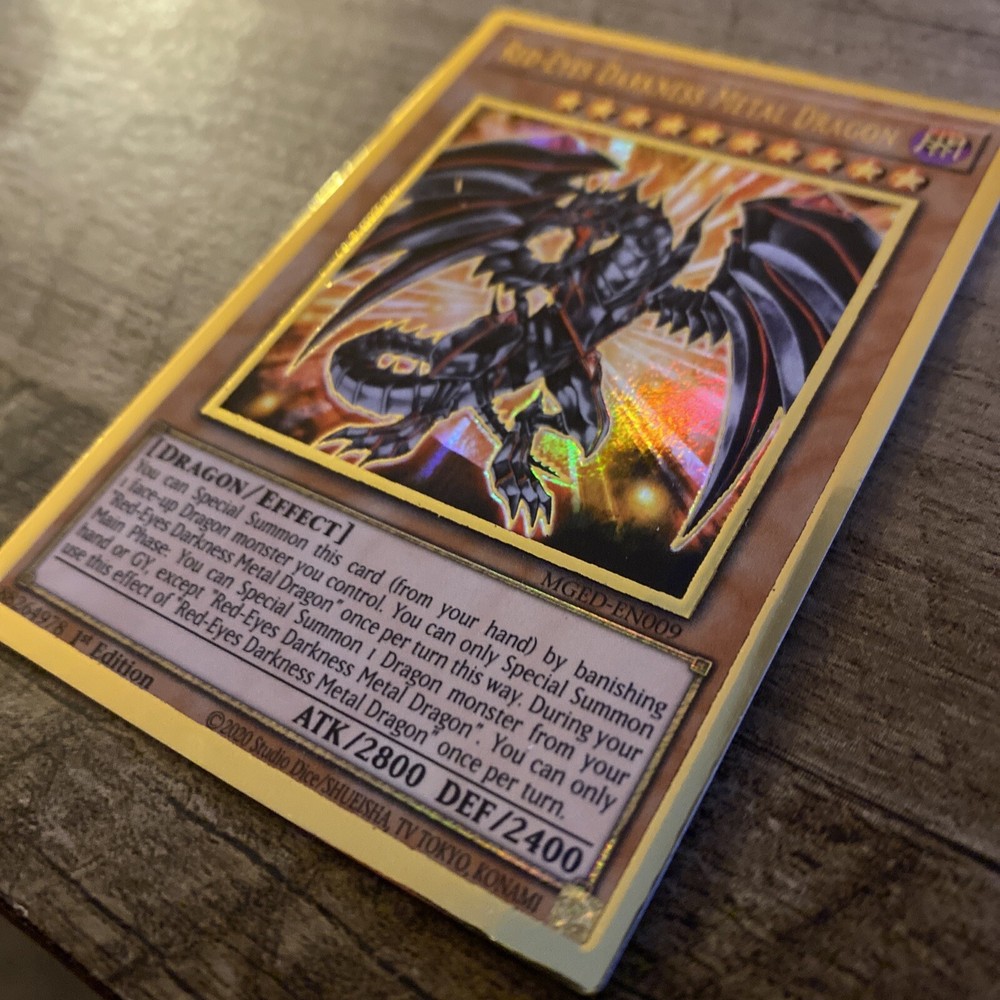 This rare and highly sought-after Red-Eyes Darkness Metal Dragon card is a must-have for any serious Yu-Gi-Oh! collector. With its stunning Premium Gold Rare finish and 1st Edition status, this card is sure to be a showpiece in any collection. Featuring Joey Wheeler as the character and a Dinosaur as the creature/monster type, this Effect card has 2800 attack/power and 2400 defense/toughness. It is made from high-quality card stock material and is standard sized. This card is in English language and has been manufactured by Konami. It is suitable for ages 6 and up and is a great addition to any fan's collection.