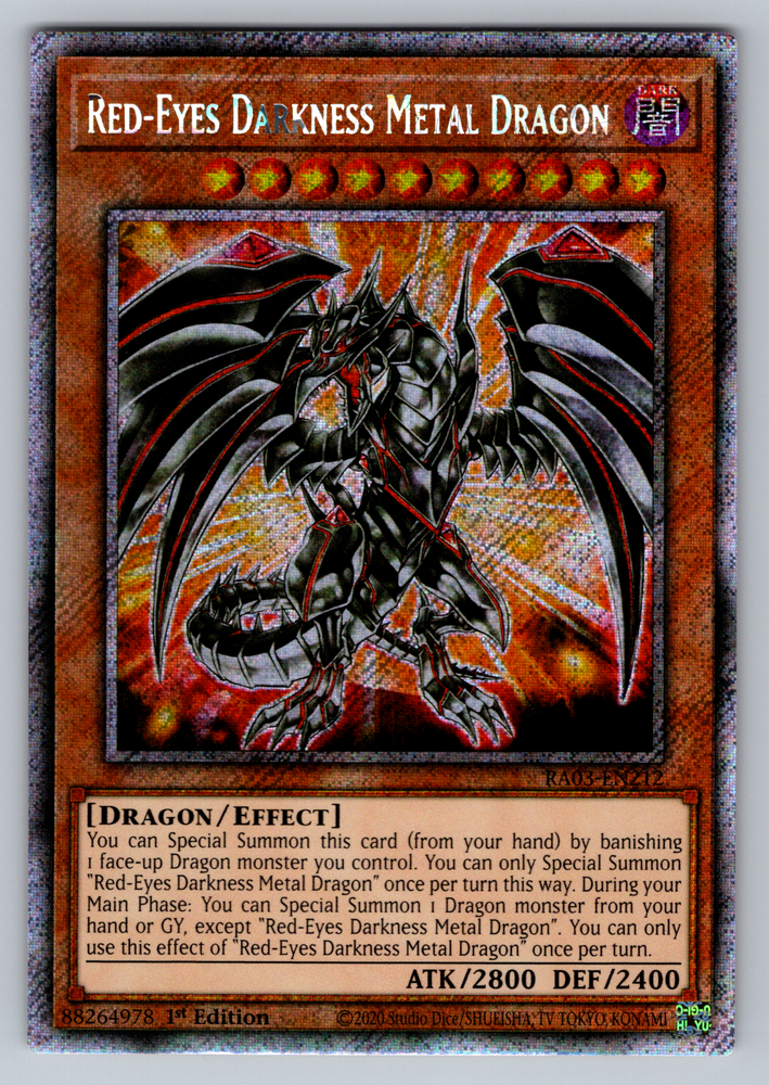 This listing is for Red-Eyes Darkness Metal Dragon RA03-EN212 (Platinum Secret Rare) from the Quarter Century Bonanza set . This is a stock photo as this is a bulk listing. You will receive the same card in the same condition specified , but it may not be the exact copy from the photo . Therefore, centering on the card you receive may differ from the centering of the card listed in the photo. Please be aware of this before purchasing. Each card will be in Near Mint condition. Cards in this listing may have some very minor imperfections (such as few small dots of whitening or a couple of very small scratches), but there will be no major damage to the cards (such as excessive whitening, scratches, edgewear, creases, water damage, etc). The cards from your order will be securely packaged in a card saver and card saver perfect fit sleeve and shipped with the eBay Standard Envelope program for cards under $20. Whether you're looking to power up your deck or add this to your collection, you'll be sure to enjoy this card! Check out our other listings for more Yu-Gi-Oh! cards!