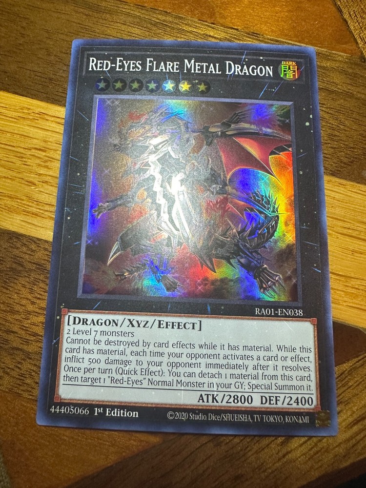 Hello! You are buying one Red-Eyes Flare Metal Dragon RA01-EN038 1st Edition Super Rare in near-mint condition! As a thank you for buying from me, I will throw in two free Yugioh commons! Thank you so much for looking, have a great day! If there is ever an issue, please let me know so I can do whatever I can to resolve it! Please check out my other items! I have many more single cards!