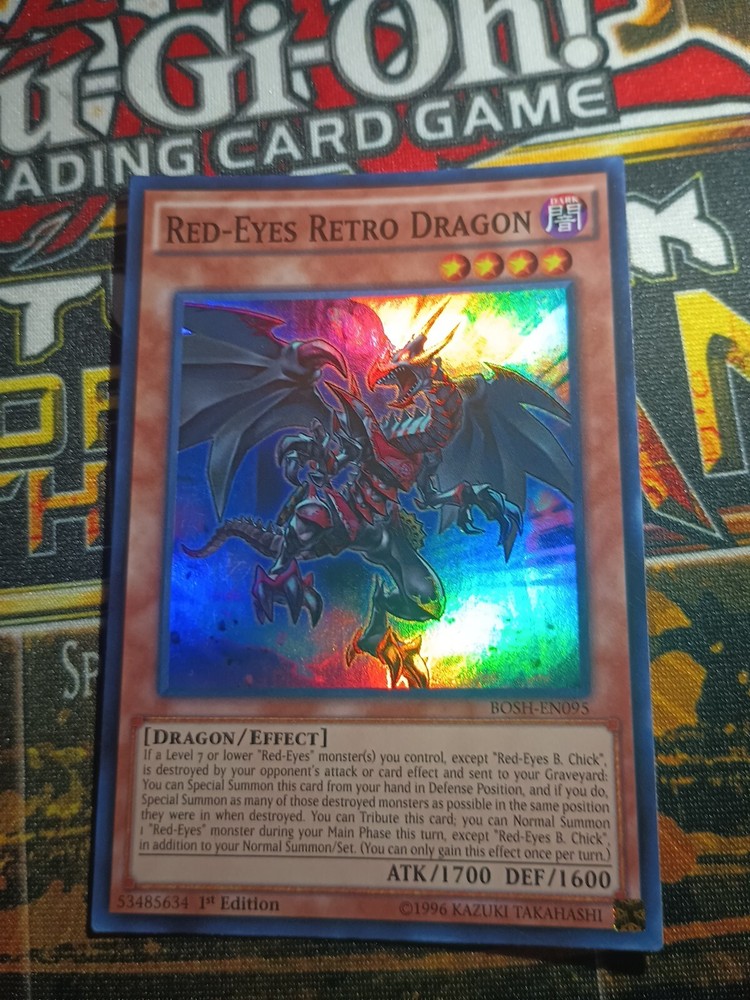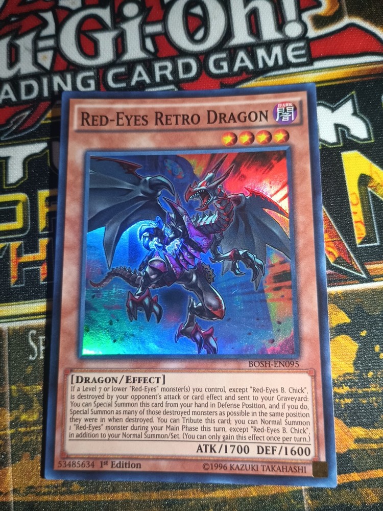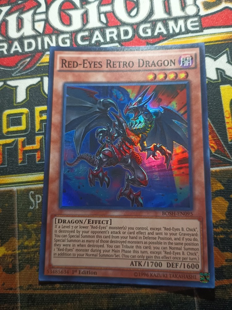 Unleash the power of mythological creatures with the Red-Eyes Retro Dragon BOSH-EN095 from the Breakers of Shadow set. This Super Rare card boasts an impressive 1600 defense and 1700 attack, making it a formidable addition to any Yu-Gi-Oh! TCG collection. The card features the iconic Red Eyes and is an Effect type monster that can turn the tide of any battle. This 1st Edition collectible, produced by Konami, is a must-have for enthusiasts and competitive players alike. With its dark attribute, the Red-Eyes Retro Dragon is a versatile option for deck building, and its English language version adds to its appeal for North American players. Add this unique card to your arsenal and watch your opponents brace for the dragon's breath.