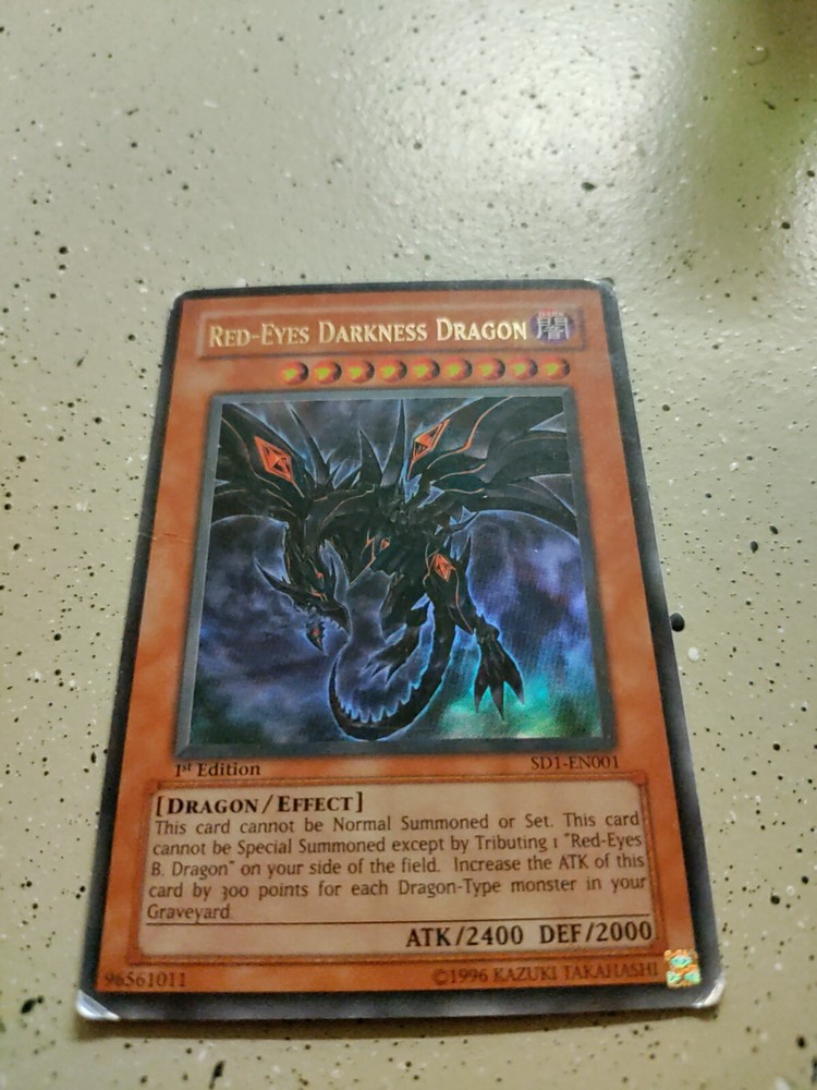 Unleash the power of darkness with the Red-Eyes Darkness Dragon, a must-have for any serious Yu-Gi-Oh! TCG collector or player. With its Ultra Rare status, this card is a standout addition to any deck, providing a formidable edge in battle. The card number SD1-EN001 marks it as a unique piece in the expansive Yu-Gi-Oh! universe. As a Dark Dragon creature/monster type, it embodies the fierce and mystical allure that fans of the game have come to love. The Red-Eyes Darkness Dragon is not just a card, it's a symbol of strength and strategy, perfect for collectors seeking to elevate their game or showcase their passion for the series.