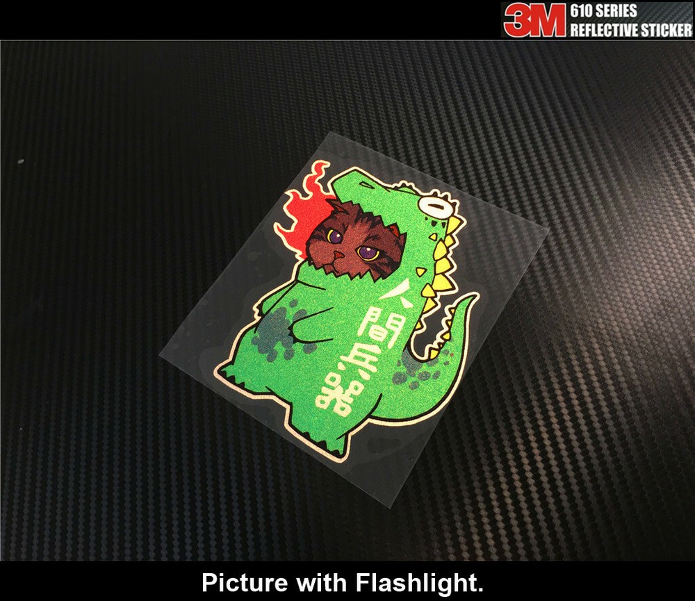 This sticker is awesome! The reflective design really pops at night, and the print quality is sharp and vibrant. Perfect for cars, laptops, or any smooth surface—it sticks well and holds up against weather. The funny cat-Godzilla mashup gets tons of attention, and the size is just right. Super durable and easy to apply. Love it!