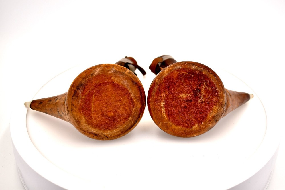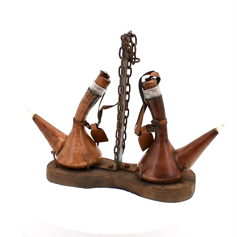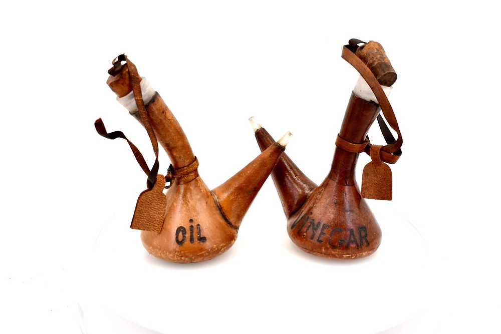 This Renaissance Style Oil & Vinegar Set features a brown wood construction with a leather-covered model. The set includes an oil bottle, vinegar bottle, and a holder/caddy with chain and nails carrier for easy transport. It has a 3-inch diameter and is 10 inches tall, making it a stylish addition to your kitchen decor.