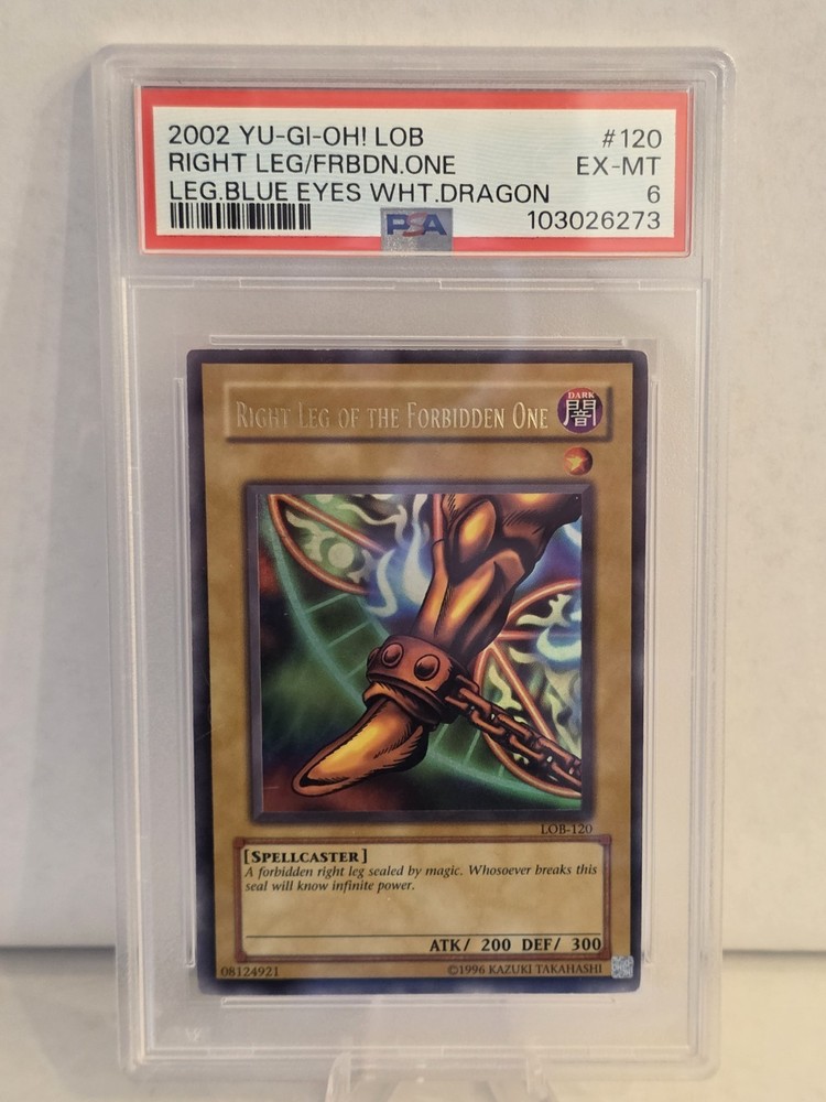 The "Right Leg of the Forbidden One" card is an Ultra Rare spellcaster from the "The Legend of Blue Eyes White Dragon" set in the Yu-Gi-Oh! TCG. With a dark attribute, this English-language card has a defense/toughness of 300 and an attack/power of 200. Manufactured by Konami, this unlimited edition card is in near mint or better condition and belongs to the normal card type with the card number LOB-120. This highly sought-after collectible is a must-have for any Yu-Gi-Oh! card enthusiast looking to enhance their deck with a powerful and rare card. *Items Ship Wednesdays/Thursdays*
