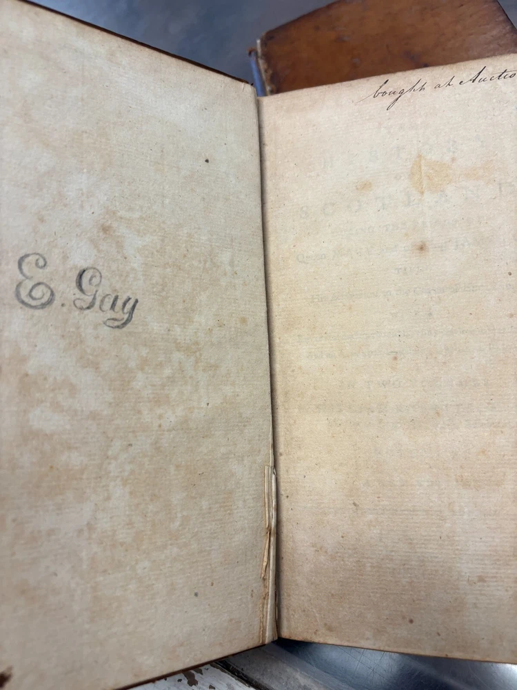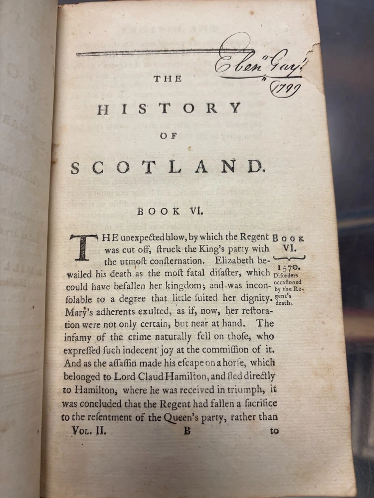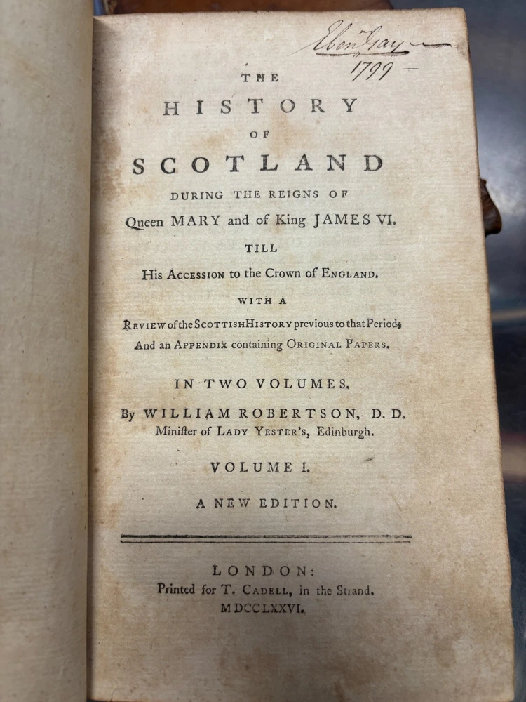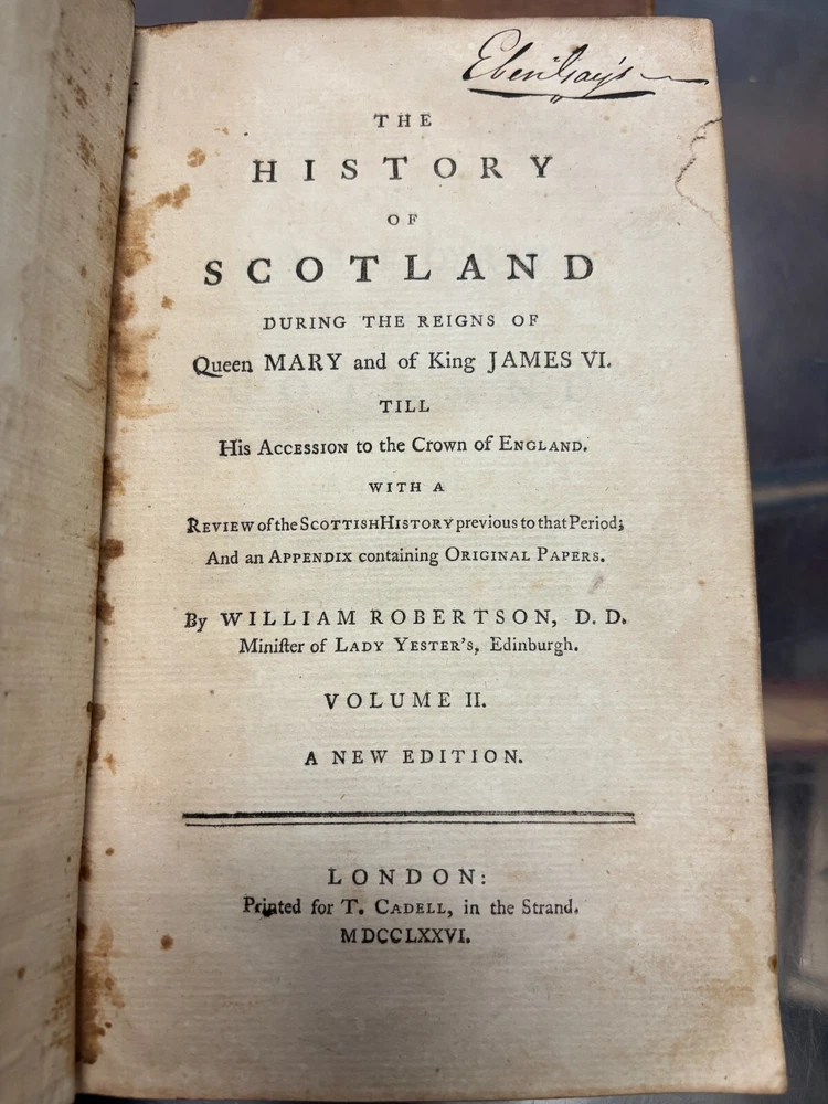 William Robertson (19 September 1721 – 11 June 1793) was a Scottish historian, cleric, and educator who served as Principal of the University of Edinburgh, Chaplain of Stirling Castle, and one of the King's Chaplains in Scotland. Robertson made significant contributions to the writing of Scottish history and the history of Spain and Spanish America, and his historiographical approach had considerable contemporary influence (particularly his emphasis on the consistency of human nature across different eras and societies). He was a notable figure in the Scottish Enlightenment, as well as a prominent representative of the Church of Scotland's moderate party. This 2 volume edition of The History of Scotland is signed (X3) by Ebenezer Gay The First Congregational Church is Suffield, CT.