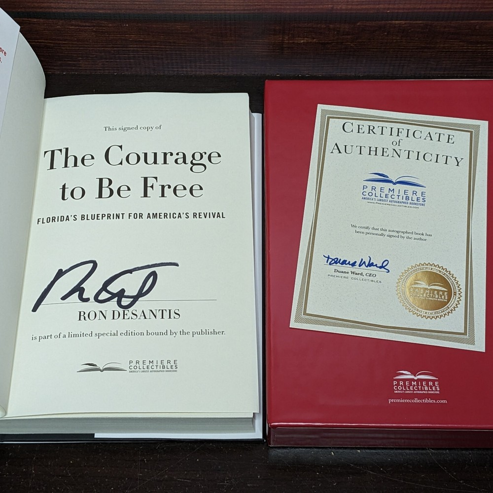 Ron DeSantis Signed Deluxe Collector Edition Set Book, Numbered out of 5600 copies. The Courage to Be Free: Florida's Blueprint for America's Revival Commemorative Autographed Numbered Limited Edition First Edition Set We have three copies of this book. Numbers 3605/5600, 3606/5600, and 3610/5600. All books come with a Certificate of Authenticity from Premiere Collectibles. Shipping via USPS Media Mail.