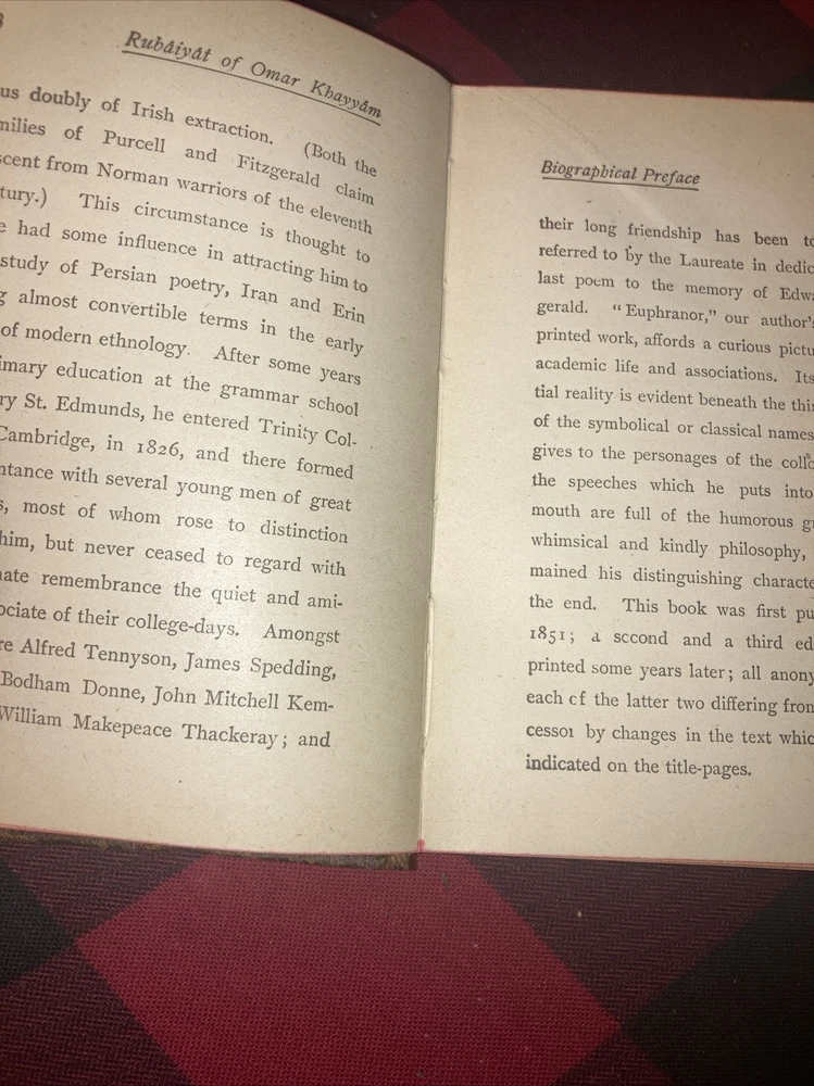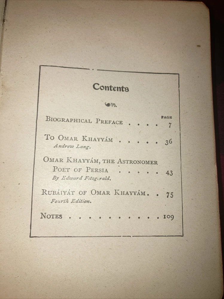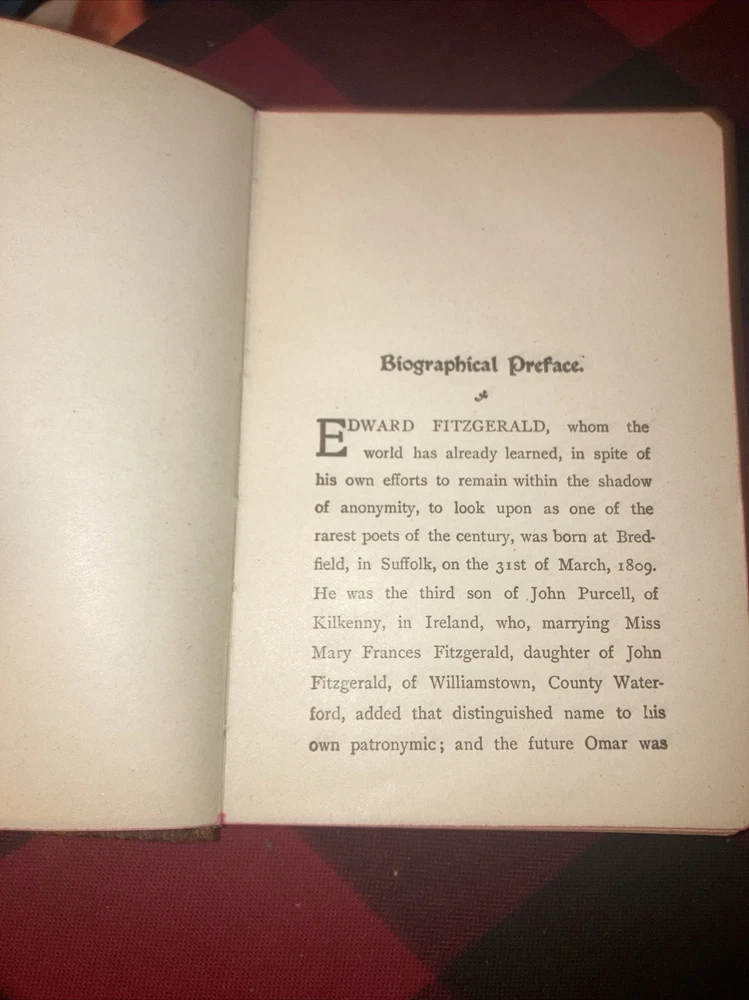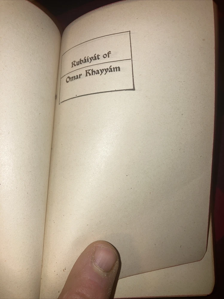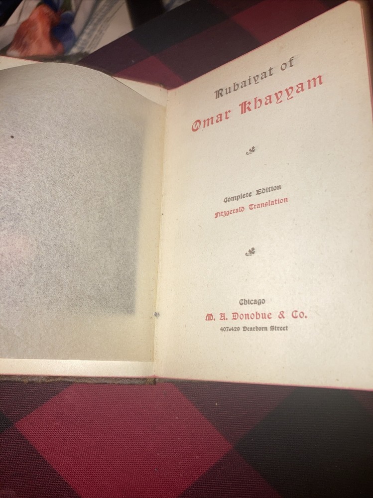 Rubaiyat of Omar Khayyam - Complete Edition - Fitzgerald Translation- RARE Printed Chicago, MH Donahue and Company Dearborn Street Beautiful engraving a couple pages inside with tissue paper. The end of the pages has the gold leaf. Front cover is separating still has the fur underneath the cover Book is complete, and all pages are inside of it . Binding is still held together though in very delicate condition Do you need additional pictures or questions? Feel free to ask I’m unsure of the exact year of this issue because I haven’t been able to find the exact likeness anywhere online Will be shipped out fast and safe in 24 hours or less