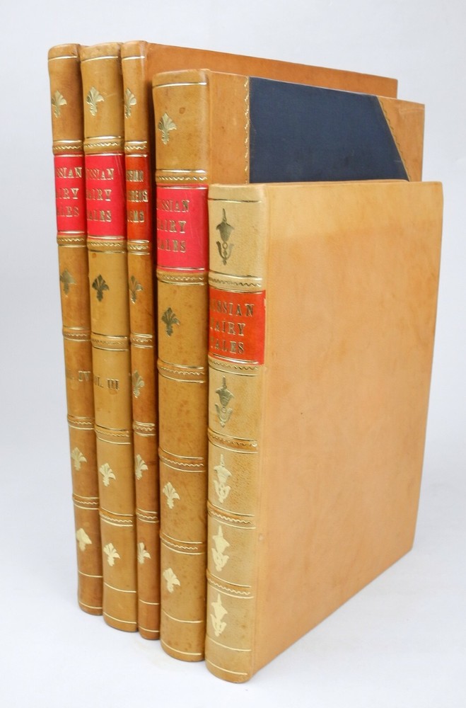 Russian Fairy Tales & Poems 5 Leather Bound Volumes These volumes were privately rebound in full and partial leather bindings. The last three volumes in the set appear to consist of multiple books that were bound together in one volume. Two of the volumes have number on the spine (III & IV). Set Includes: Volume 1 - (We are considering the smallest, full leather volume as volume 1) - Vasilia the Beautiful - Russian Fairy Tales - Progress Publishers, Moscow - Stated Second Printing 1974 - 213 Pages - Consists of 16 Russian Fairy Tales. Volume 2 - (The thin, full leather cover volume) - Uncle Steeple and Other Poems - Progress Publishers, Moscow - No date of publication Stated - 63 Pages - Consists of 11 Russian Poems. Volume 3 (The half leather volume, marked Vol. III on the spine) - Includes the following Books bound together (All Published by Progress Publishers): Within -And-Without-Wears-His-Coat-Wrong-Side-Out - A Byelorussian Folk Tale - 1975 Mergen and His Friends - A Nanai Folk Tale - 1973 The Sun Princess and Her Deliverer - A Lithuanian Folk Tale - No date of Publication Stated One, Two Three... - 1973 Everyone Likes to Draw - 1975 The Fisherman and The Goldfish - Second edition 1973 The Wolf Who Sang Songs - No Date The Tiger's Nephew - No Date Whose is the Sun? - 1973 Volume 4 (The half leather volume, marked Vol IV on the spine) - Includes the following Books bound together (All Published by Progress Publishers): Good Manners & Pussies Mustn't Fight - No date The Fox and The Hare - 1973 There Once Was an Elephant - 1974 Shuktugan - 1975 Mergen and His Friends - A Nanai Folk Tale - 1973 - Duplicate from Vol III The Fisherman and The Goldfish - Second edition 1973 - Duplicate from Vol III The Legend of the Stone Cutter - 1975 Volume 5 (The half leather volume with no volume listing on spine) - Includes the following Books bound together: The Little Humpbacked Horse - Progress Publishers - Third Edition 1976 The Fire - Bird - Progress Publishers - No Date Two Chanticleers - Children's Folk Rhymes and a Folk Tale From The Ukraine - 1975 - Veselka Publisher A truly one of a kind set! This is an amazing set of Russian Fairy Tales and Poems bound in beautiful long lasting leather volumes. S17C - E