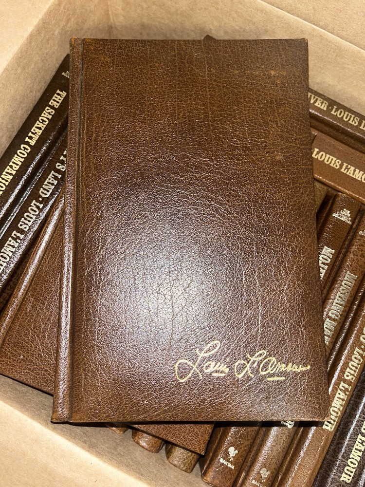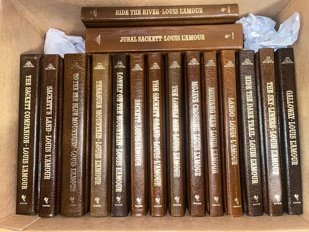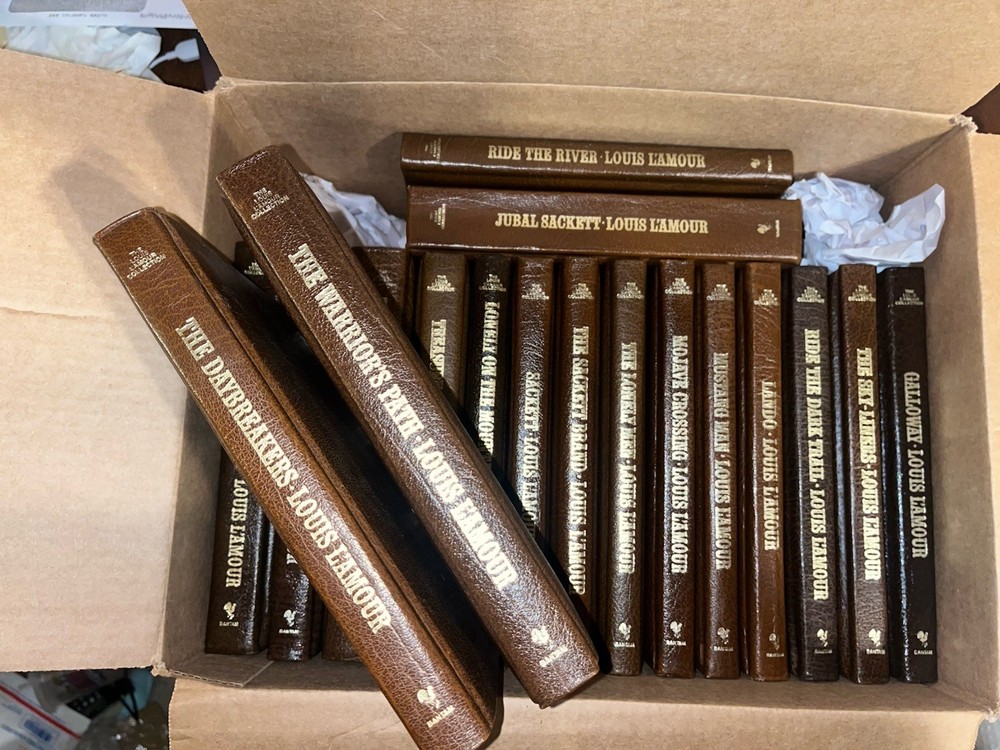 Sackett Family!!! 18 book set in DELUXE GENUINE LEATHER edition!!! The Louis L’Amour Collection premium collector’s deluxe edition in GENUINE LEATHER. These books originally sold by subscription for $26.99. High quality paper and gold gilt page edges. These books originally are out of print! This listing is for all 18 books from the famous SACKETT family series and the guide to the series, “The Sackett Companion.” Very difficult books to find and to have a complete set of leather Sackett’s is unheard of. There is no better collectible in the L’Amour collection. Titles included: Sackett Companion (author’s notes and descriptions) Sackett’s Land (Barnabas Sackett) To the Far Blue Mountains (Barnabas Sackett) The Warriors Path ((Kin Ring & Yance Sackett) Jubal Sackett (Jubal Sackett) Ride the River (Echo Sackett) The Daybreakers (Tyrel and Orrin Sackett) Treasure Mountain (Tyrel, Orrin, and Tell Sackett) Lonely on the Mountain (Tyrel, Orrin, and Tell Sackett)) Sackett (Tell Sackett) The Sackett Brand (Tell Sackett and many others) The Lonely Men (Tell Sackett) Mojave Crossing (Tell and Nolan Sackett) Mustang Man (Nolan Sackett) Lando (Lando Sackett) Galloway (Galloway & Flagan Sackett) The Sky-Liners (Galloway & Flagan Sackett) Ride the Dark Trail (Logan Sackett) 18 total books!!! The Louis L’Amour Collection is a subscription books series that contains 122 books of fiction, non-fiction, poetry, biography and more. Later seven volumes were released that organized the short stories into genres. These volumes are among the rarest books in the L’Amour Collection. I would like to be your Louis L’Amour Collection supplier. All my books are carefully cared for including cleaning and sanitizing. I will tell you the condition of each book accurately. Having managed a private library of almost 100,000 books gives me the knowledge and skills to appropriately handle your future L’Amour Collection in a professional manner. Shipped securely wrapped and in a box. This volume will not be damaged in the mail. If you are not satisfied, please contact before posting feedback.