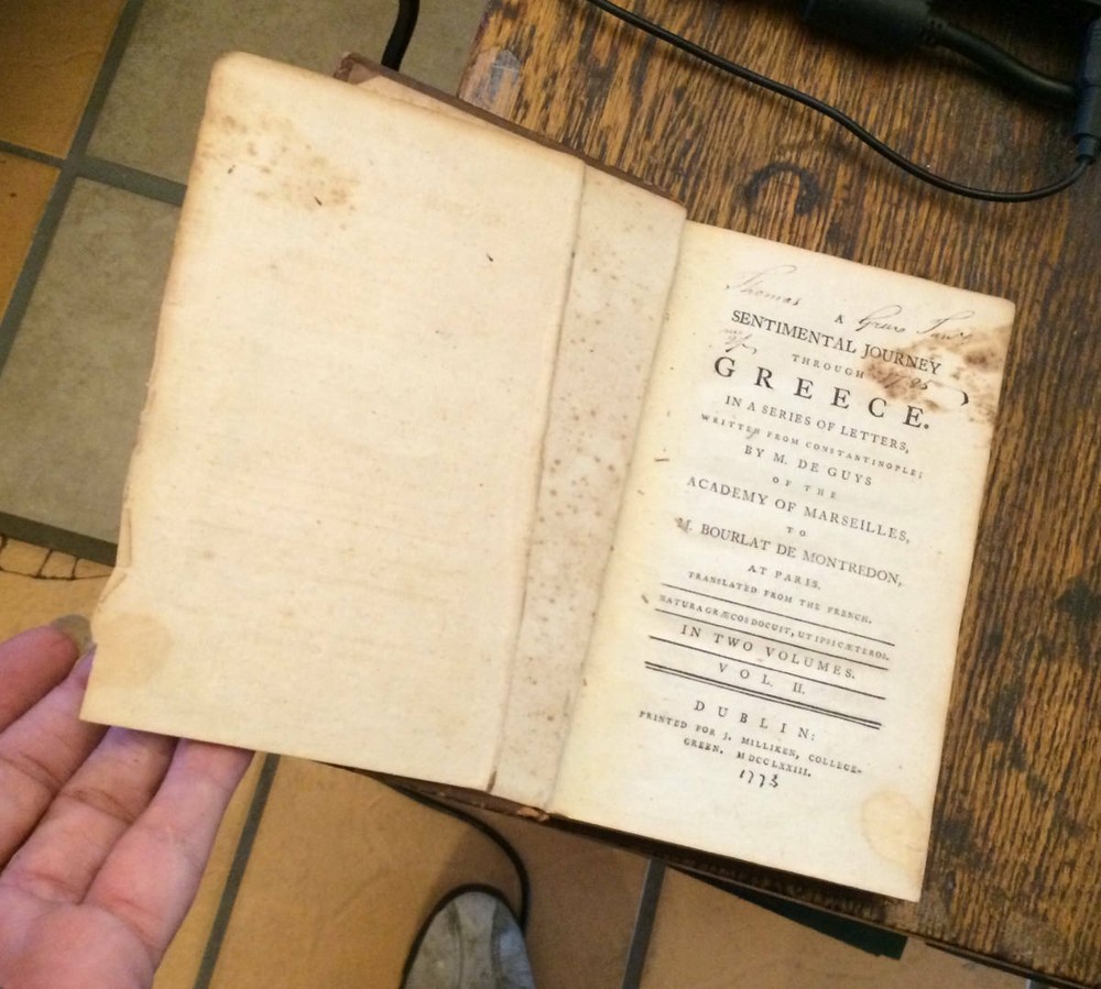 From Xochi's Upper Hall Showcase (btm left). 4 x 6 3/4", 372 pp (V1), 344 pp (V2), J Milliken College Green, 1773 Irish First Edition. By M De Buys. Very rare 'A series of letters written from Constan...