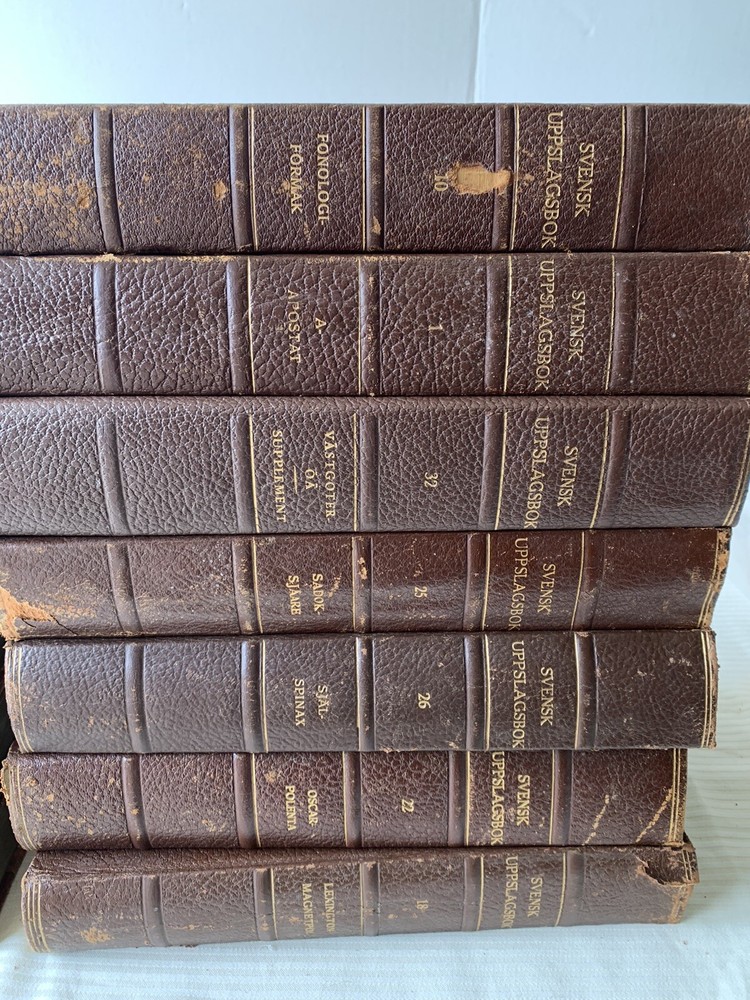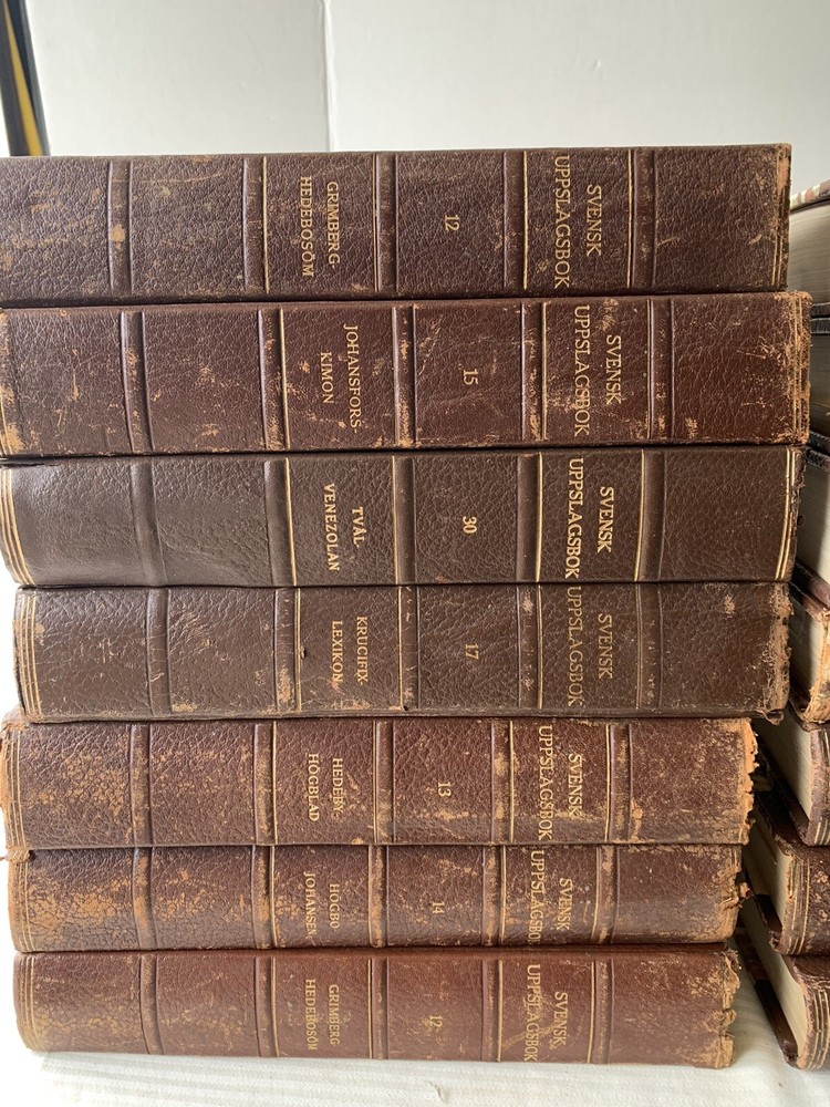 SET OF 14 PARTIAL LEATHERBOUND BOOKS SWEDISH ENCYCLOPEDIA 2nd EDITION. SVENSK UPPSLAGSBOK. SWEDISH ENCYCLOPEDIA PUBLISHED 1949.